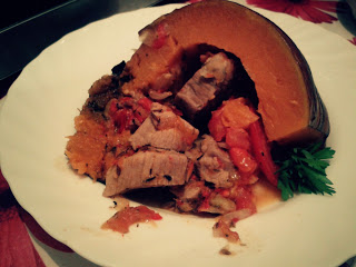 Se umple dovleacul cu compozitia de carne si legume de pe foc, se taie o rosie mai mare felii si se pune un strat deasupra compozitiei.