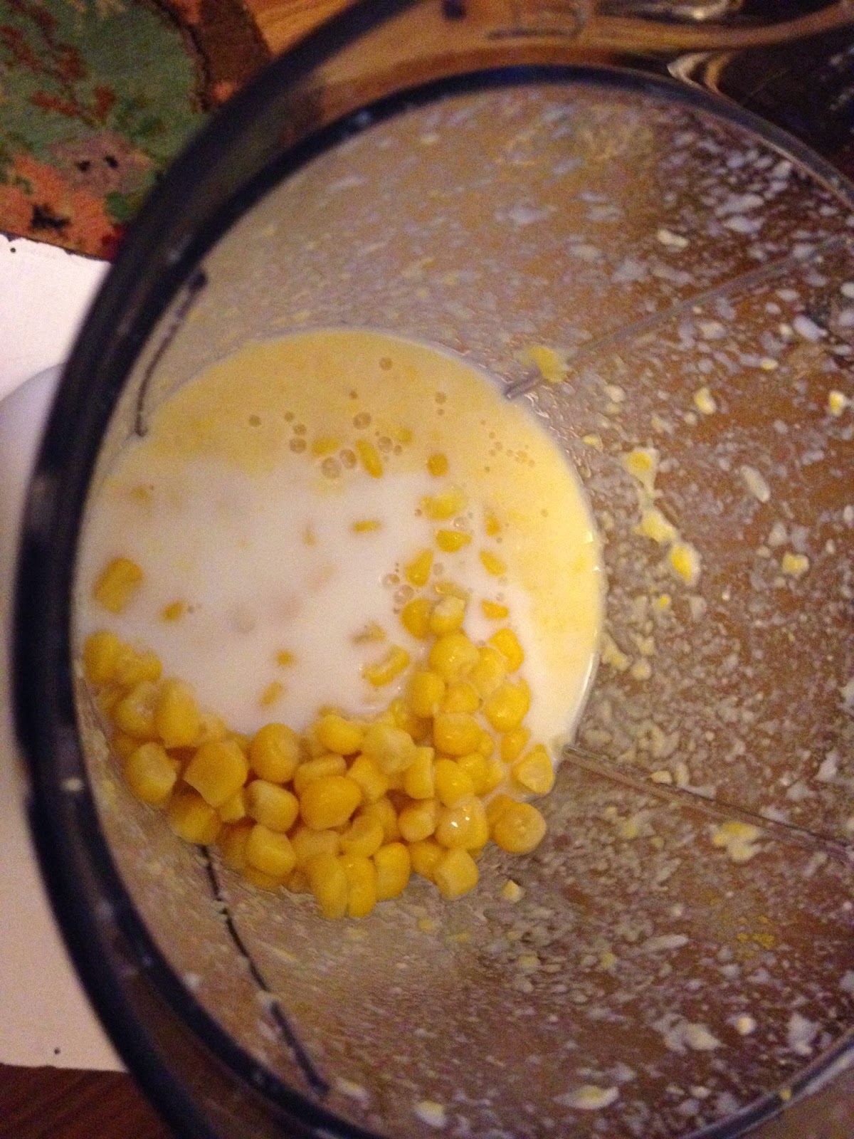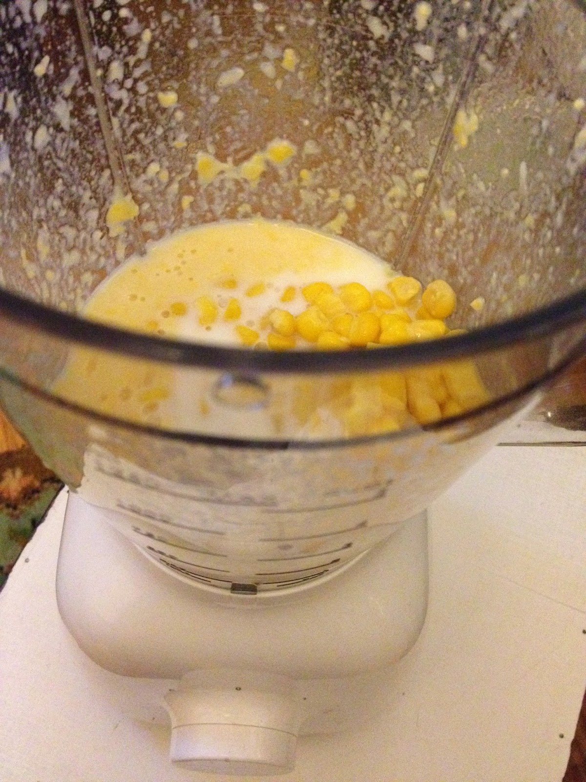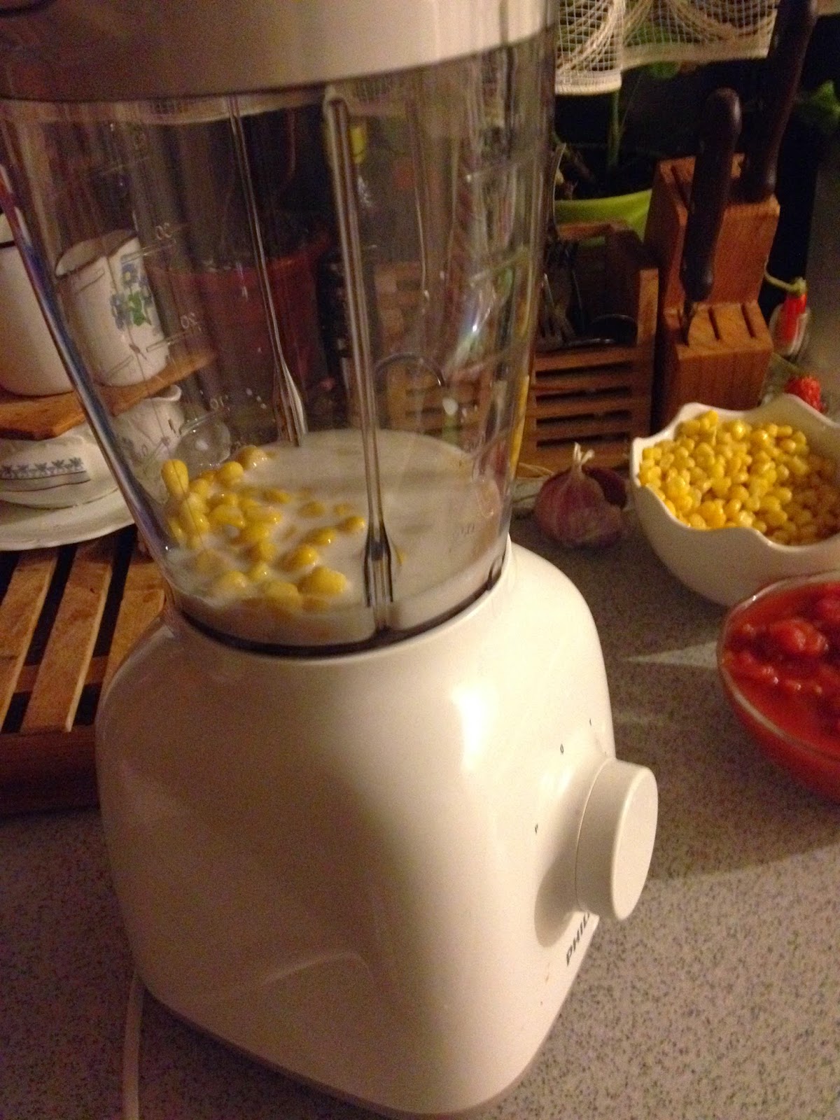 Jumatate din cantitatea de porumb o mixam intr-un blender impreuna cu laptele, pana devine o pasta aurie.