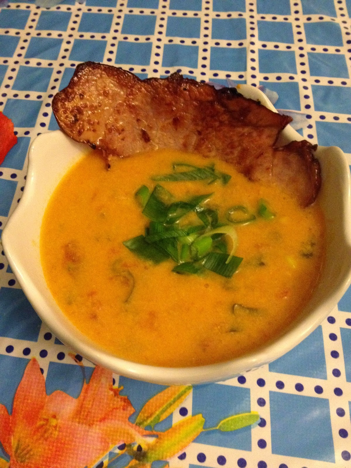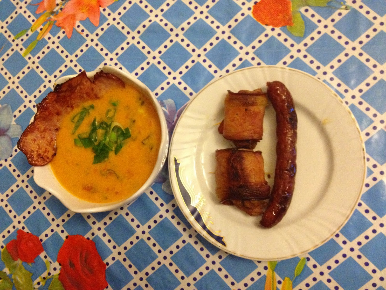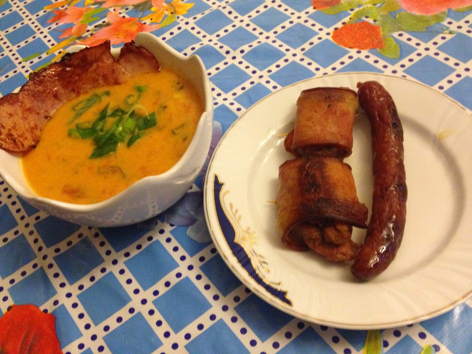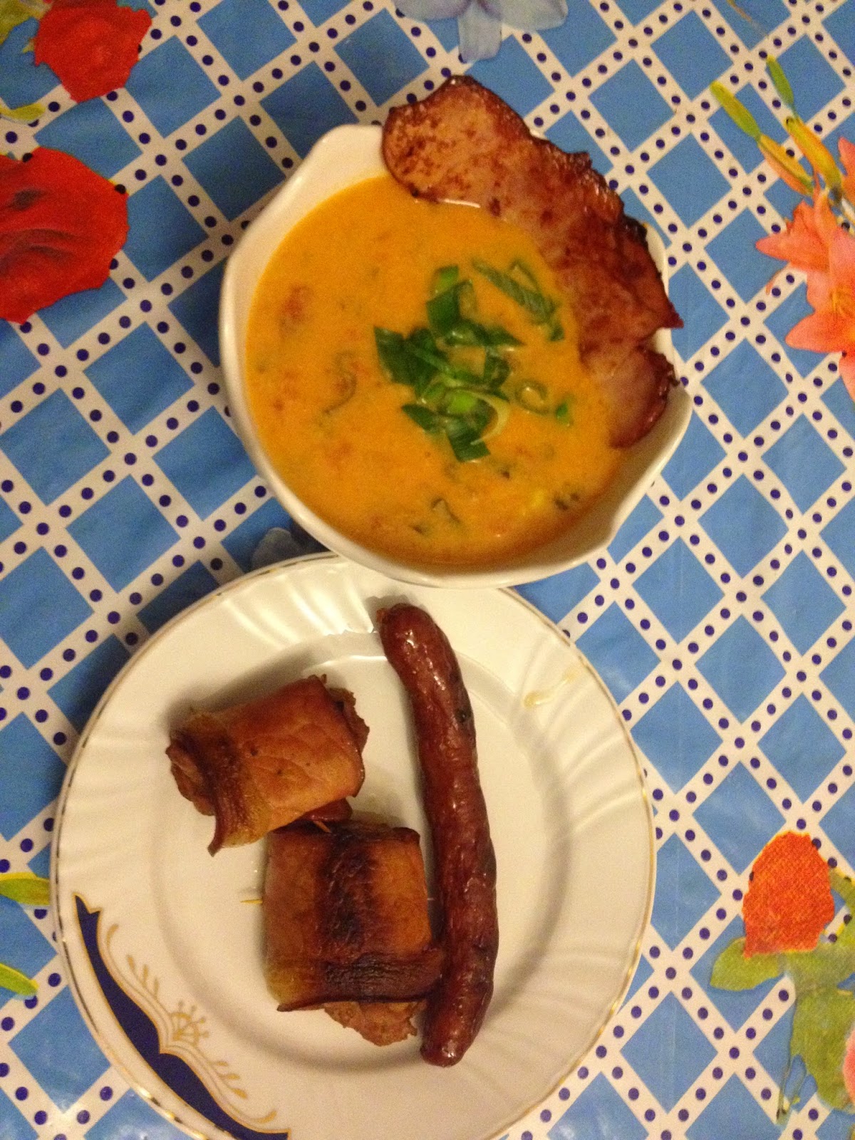 A-2-a saptamana cu Caroli: Supa de porumb si sunculita taraneasca de la Caroli cu muschiulet de porc invelit in sunculita taraneasca de la Caroli.