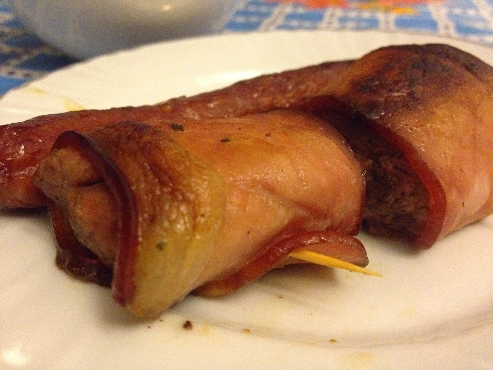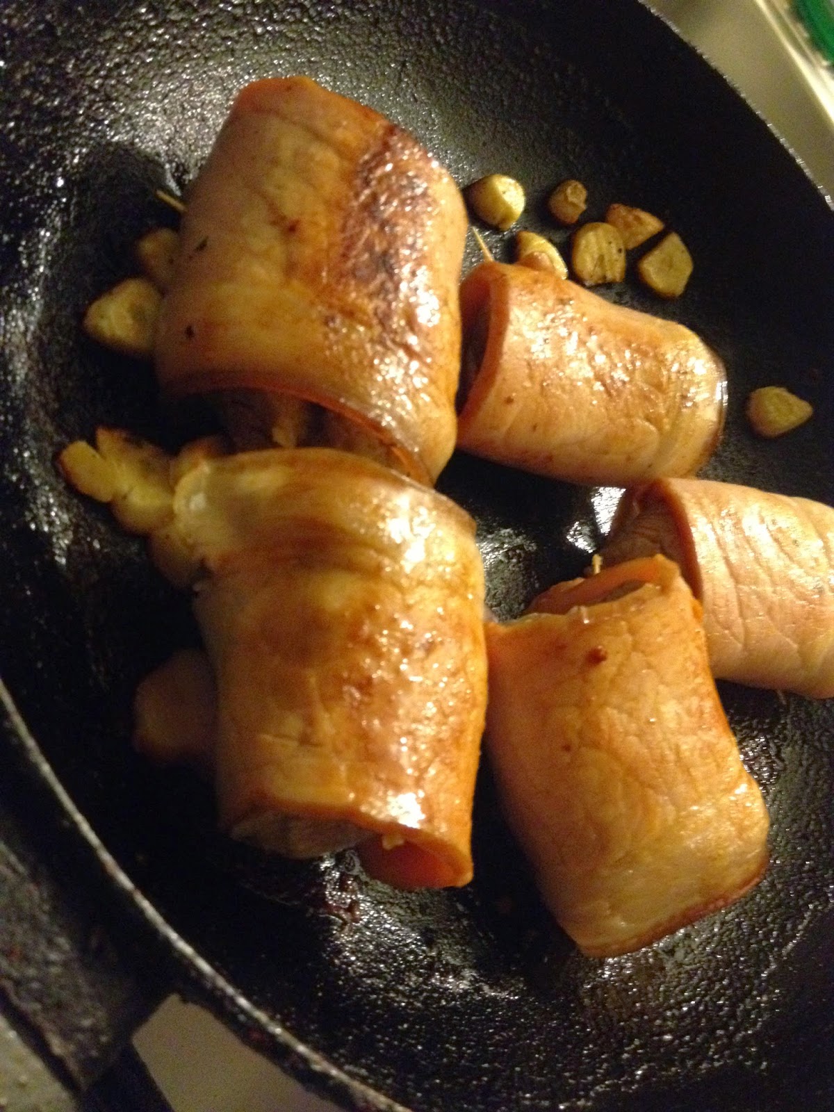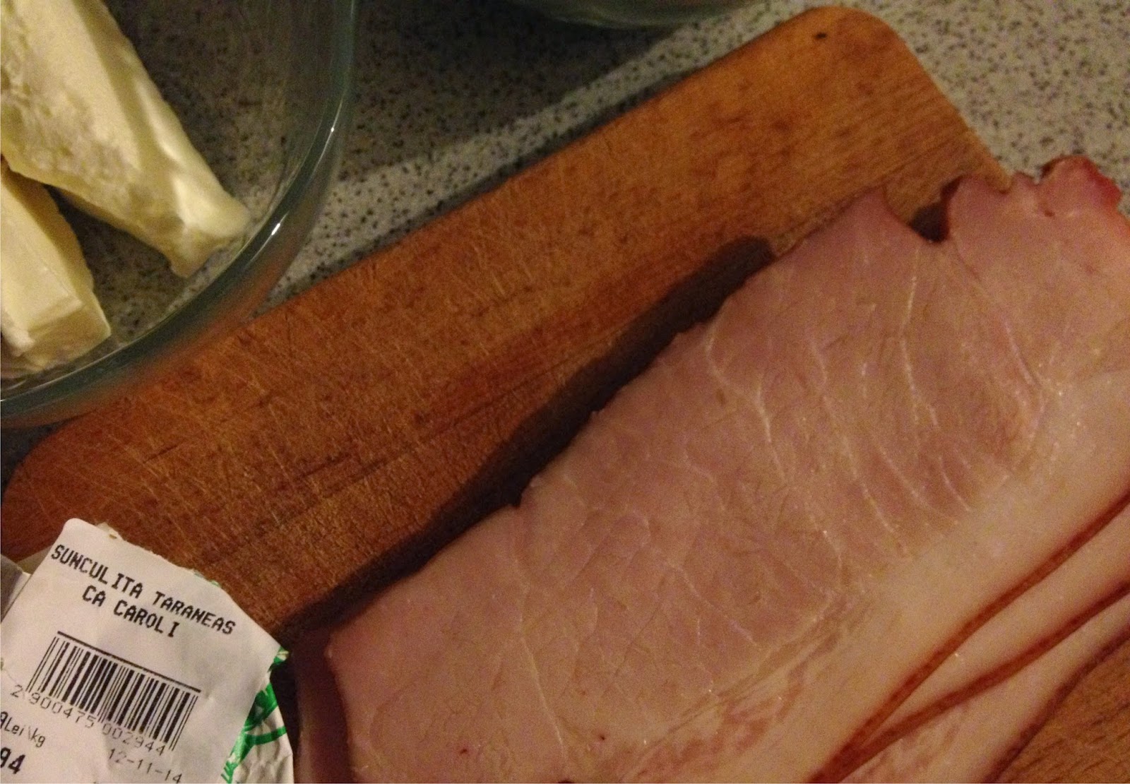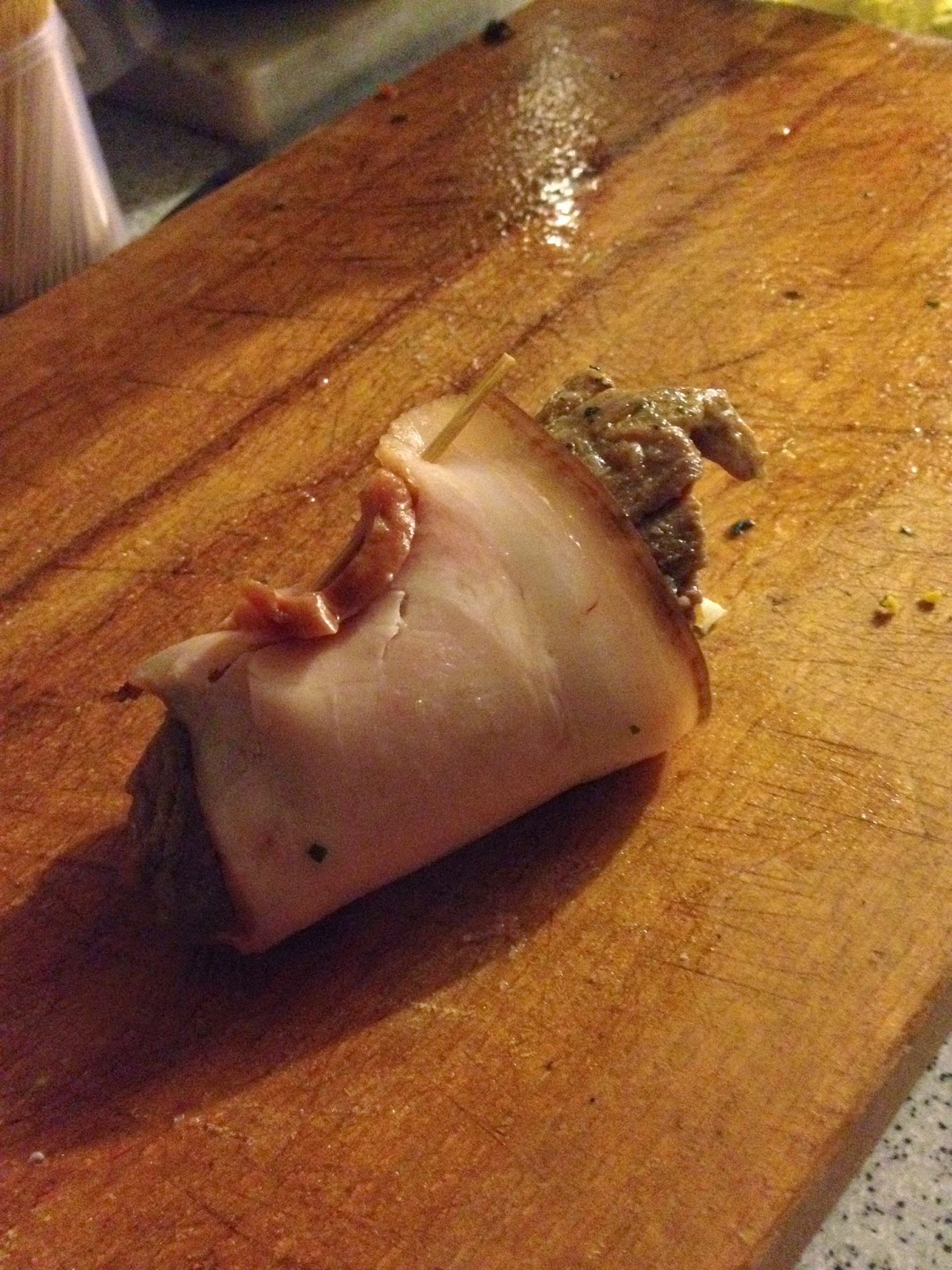 Luam muschiuletul si il taiem bucatele mici, il condimentam si il prajim cateva minute in tigaie, cu ulei si cateva capatani de usturoi. Il scoatem si il infasuram usor in feliile de sunca taraneasca de la Caroli.