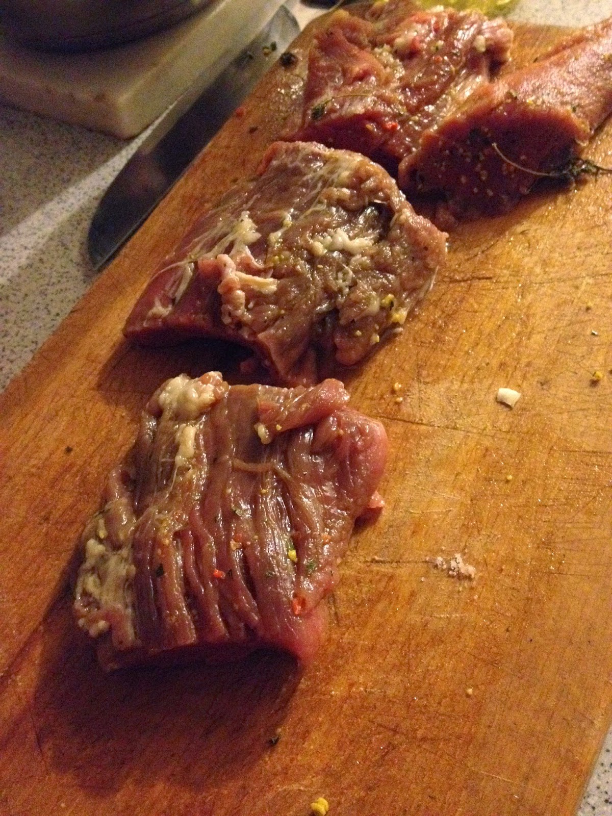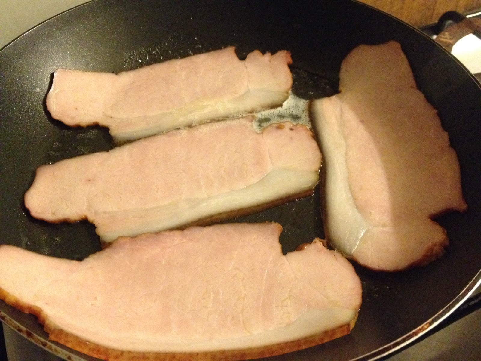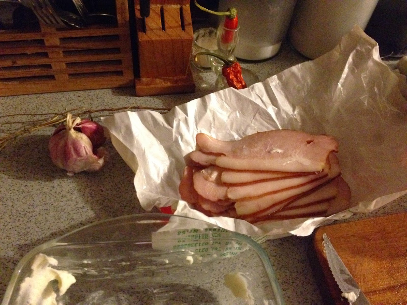 Luam muschiuletul si il taiem bucatele mici, il condimentam si il prajim cateva minute in tigaie, cu ulei si cateva capatani de usturoi. Il scoatem si il infasuram usor in feliile de sunca taraneasca de la Caroli.