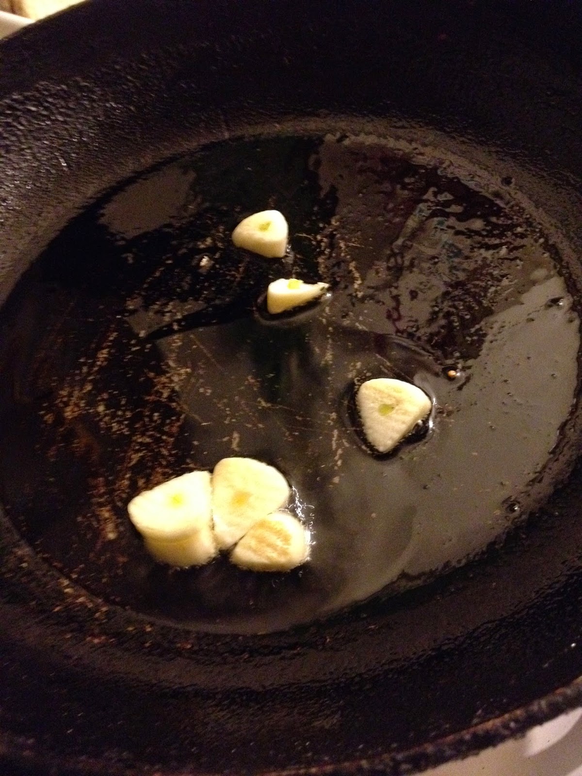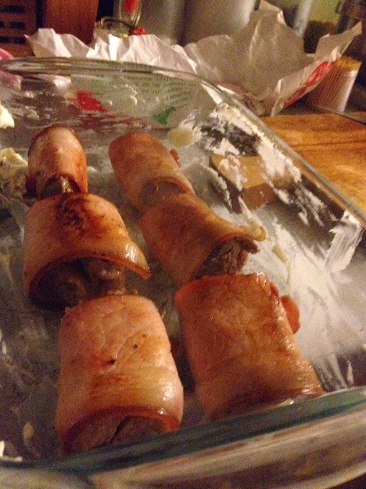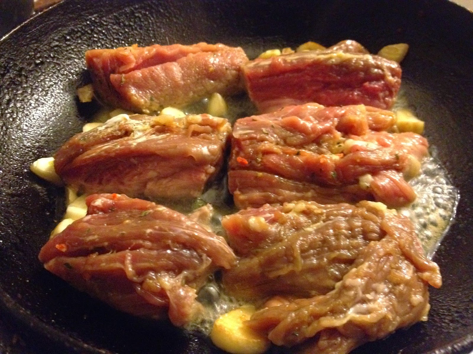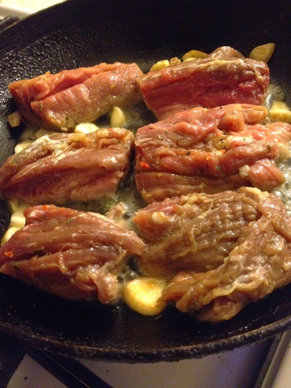 Luam muschiuletul si il taiem bucatele mici, il condimentam si il prajim cateva minute in tigaie, cu ulei si cateva capatani de usturoi. Il scoatem si il infasuram usor in feliile de sunca taraneasca de la Caroli.