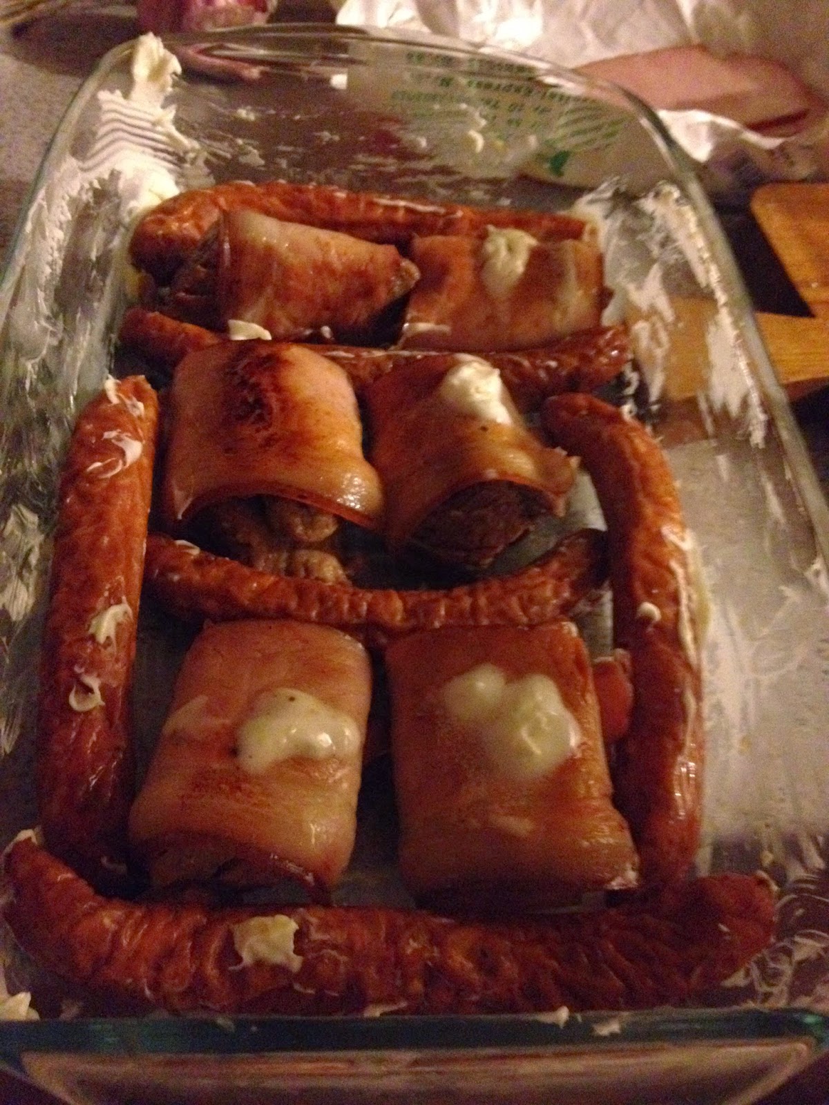 Tapetam o tava cu unt si asezam bucatelele de muschiulet de porc invelite in sunculita taraneasca de la Caroli. Noi am pus si cativa carnaciori si le-am pus putin unt pe fiecare bucatica si putin vin. Le-am bagat la cuptor pana s-au rumenit foarte bine, cred ca 30-40 minute.