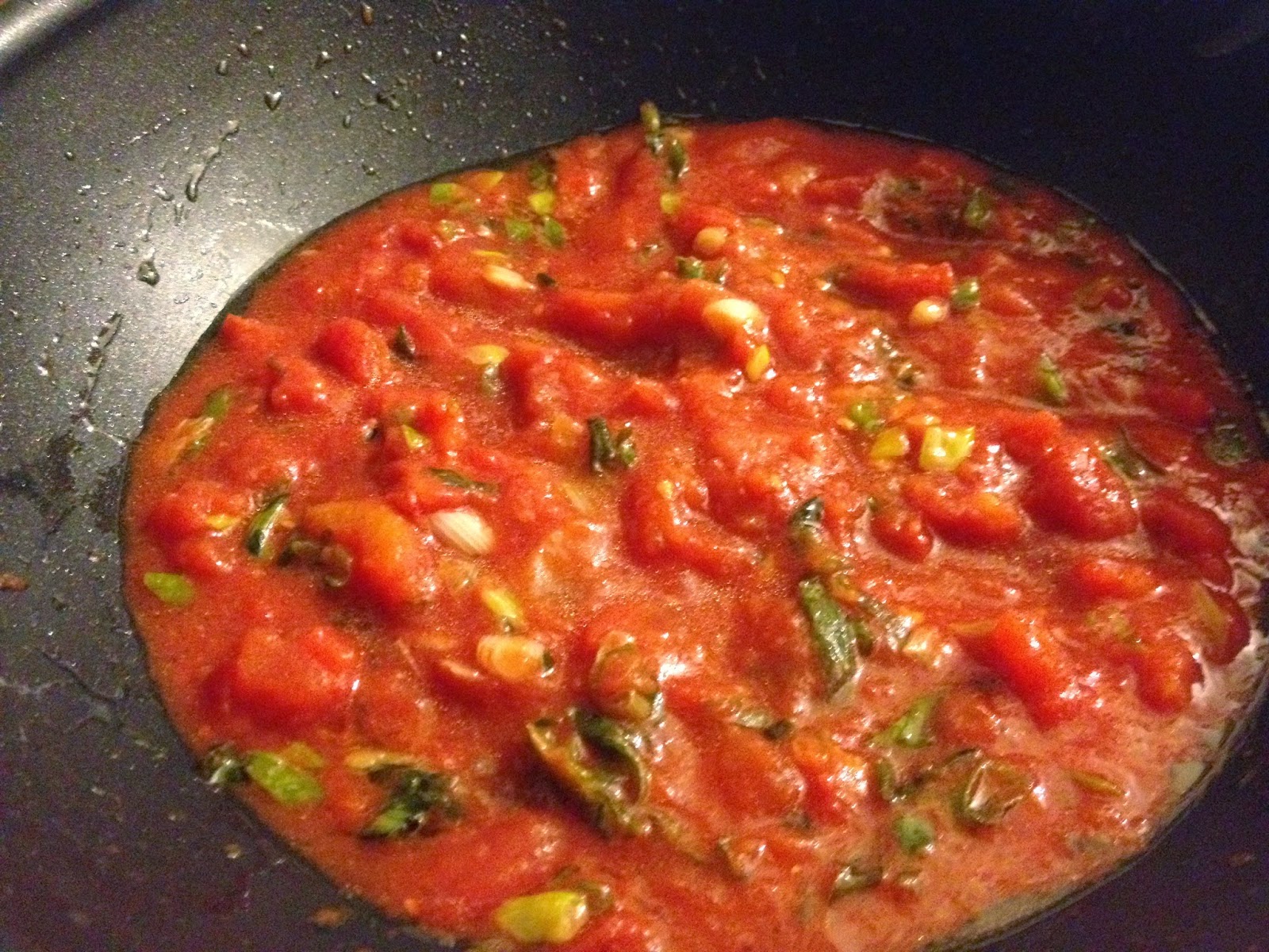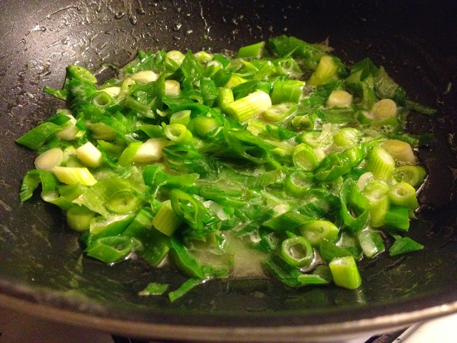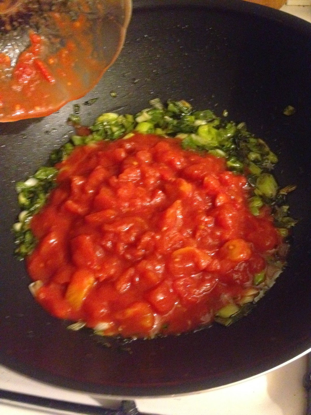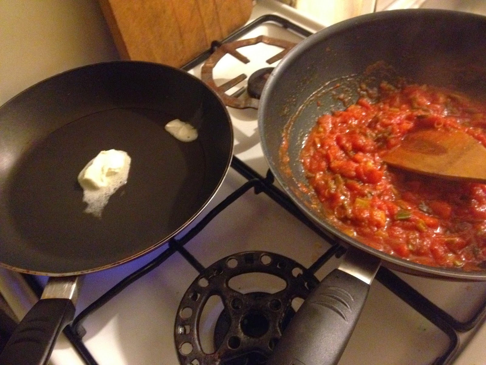 Intr-o cratita mai mica, topim untul sau incingem uleiul, punem la calit ceapa tocata si rosiile, pentru cateva minute.