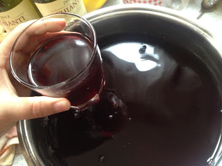 Prin urmare, am fiert 2 l de vin rosu sec, in care, spre final, am adaugat esenta de migdale.