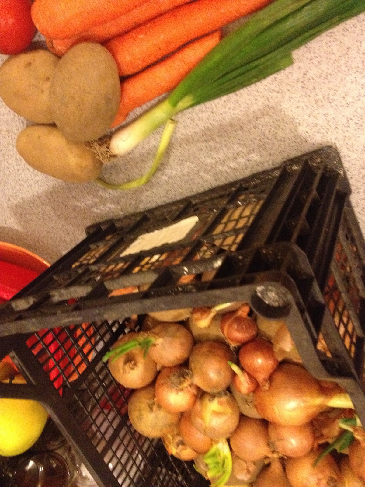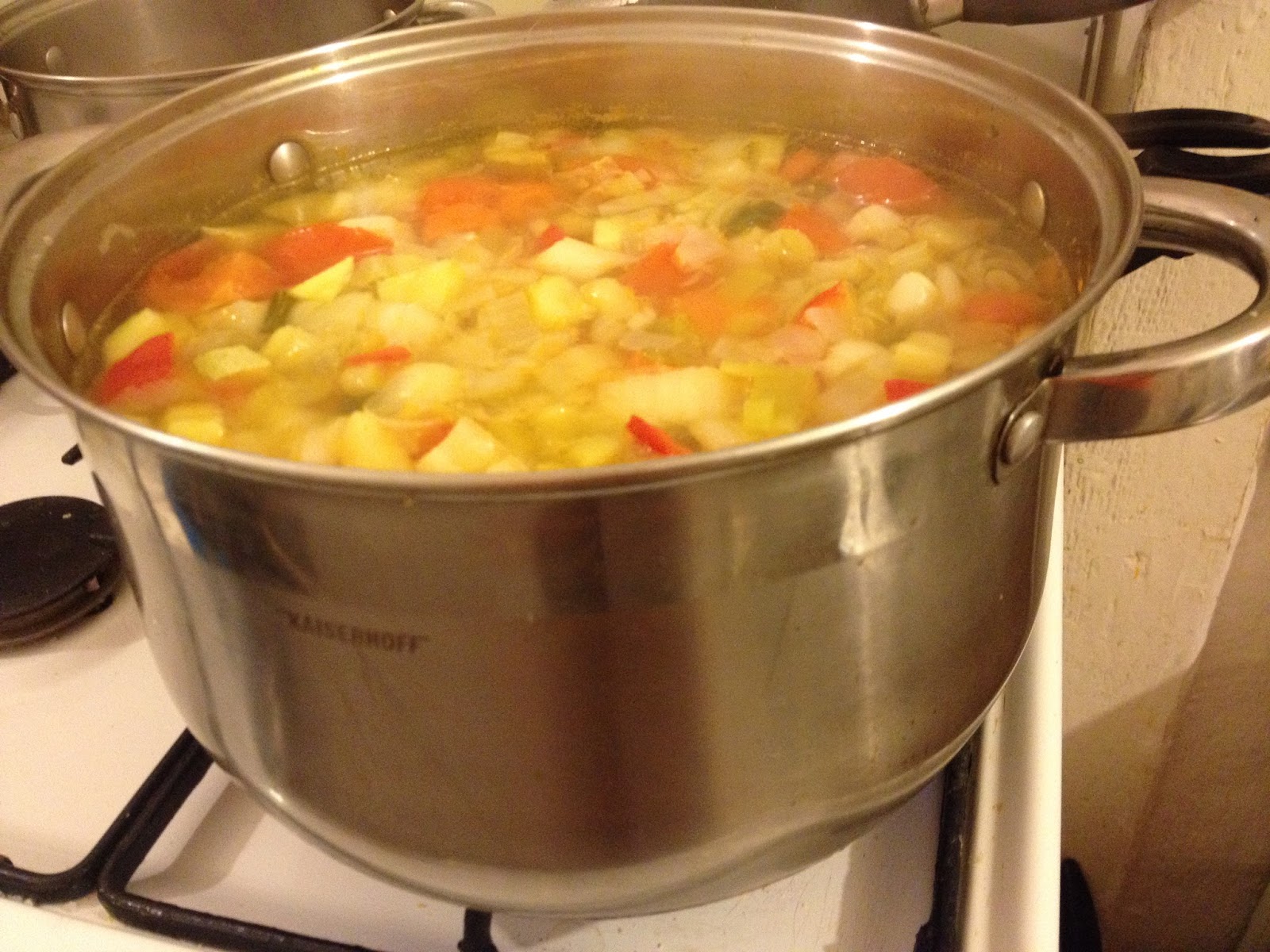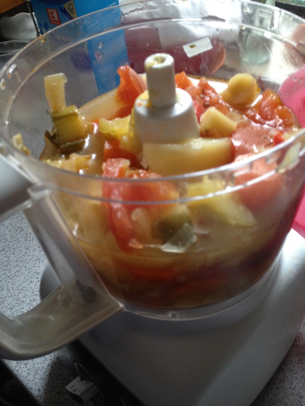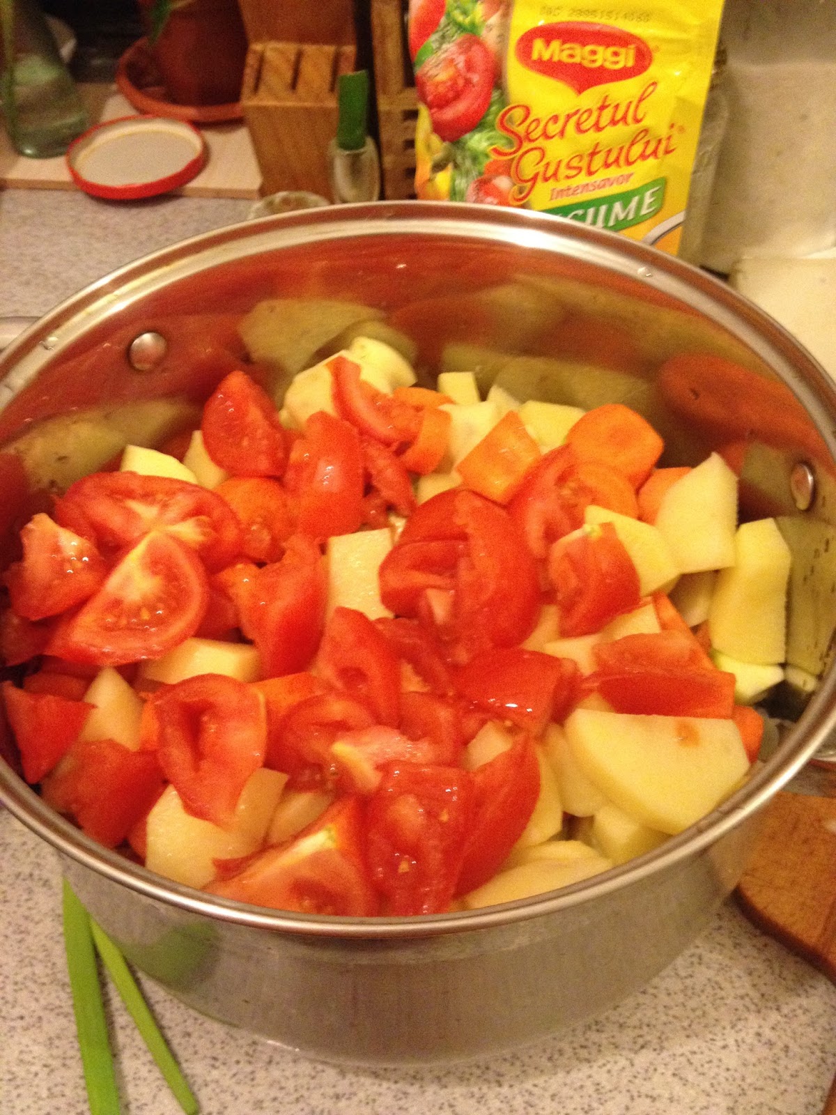 Am spalat, curatat si taiat bucatele toate legumele si le-am pus la fiert in apa cu maggi.