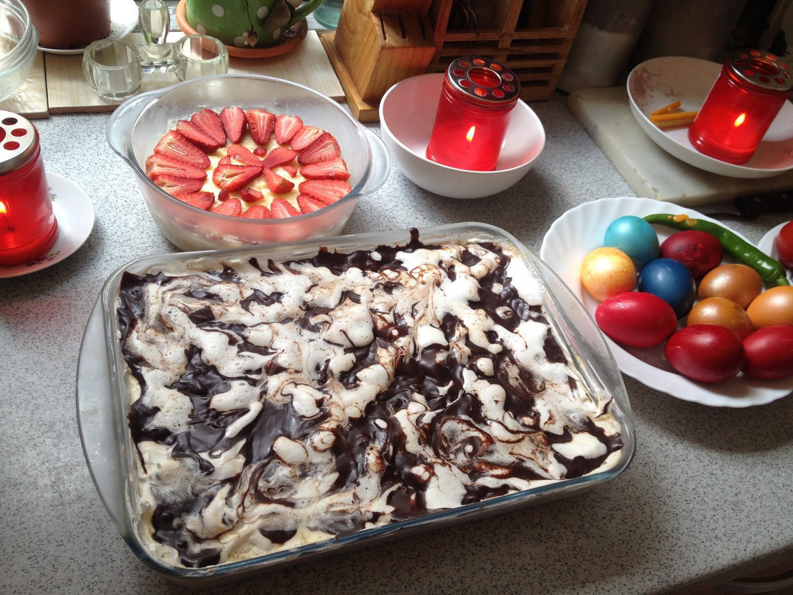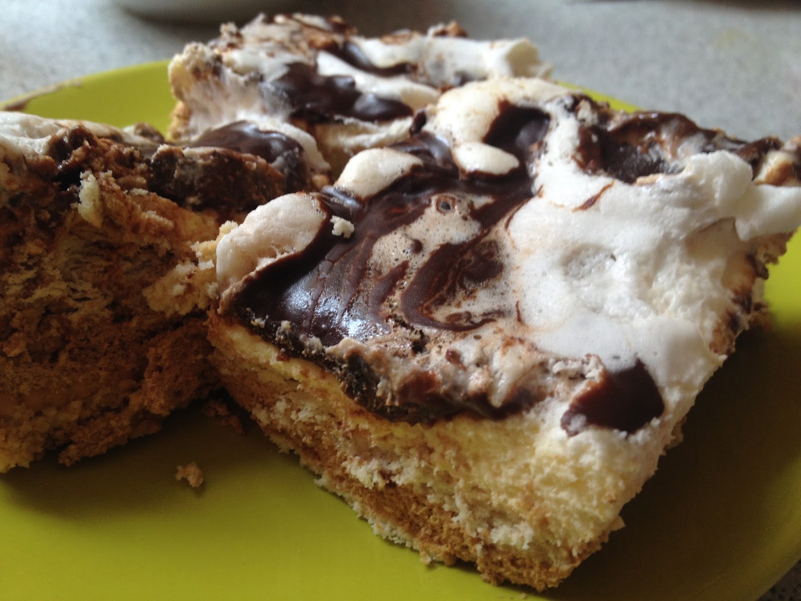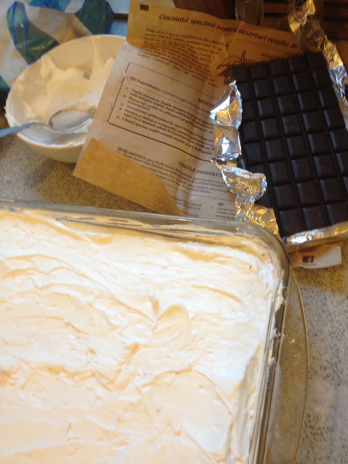 Am pregatit cu lapte toate cremele. Am incalzit laptele si am inmuiat fiecare biscuite in lapte cald, apoi am pus un strat de biscuiti si crema de caramel, un alt strat de biscuiti si crema de vanilie, peste crema de vanilie am pus frisca, apoi am turnat ciocolata topita pe deasupra. Deoarece ciocolata a fost calda, s-a amestecat cu frisca si a dat un efect vizual foarte frumos.