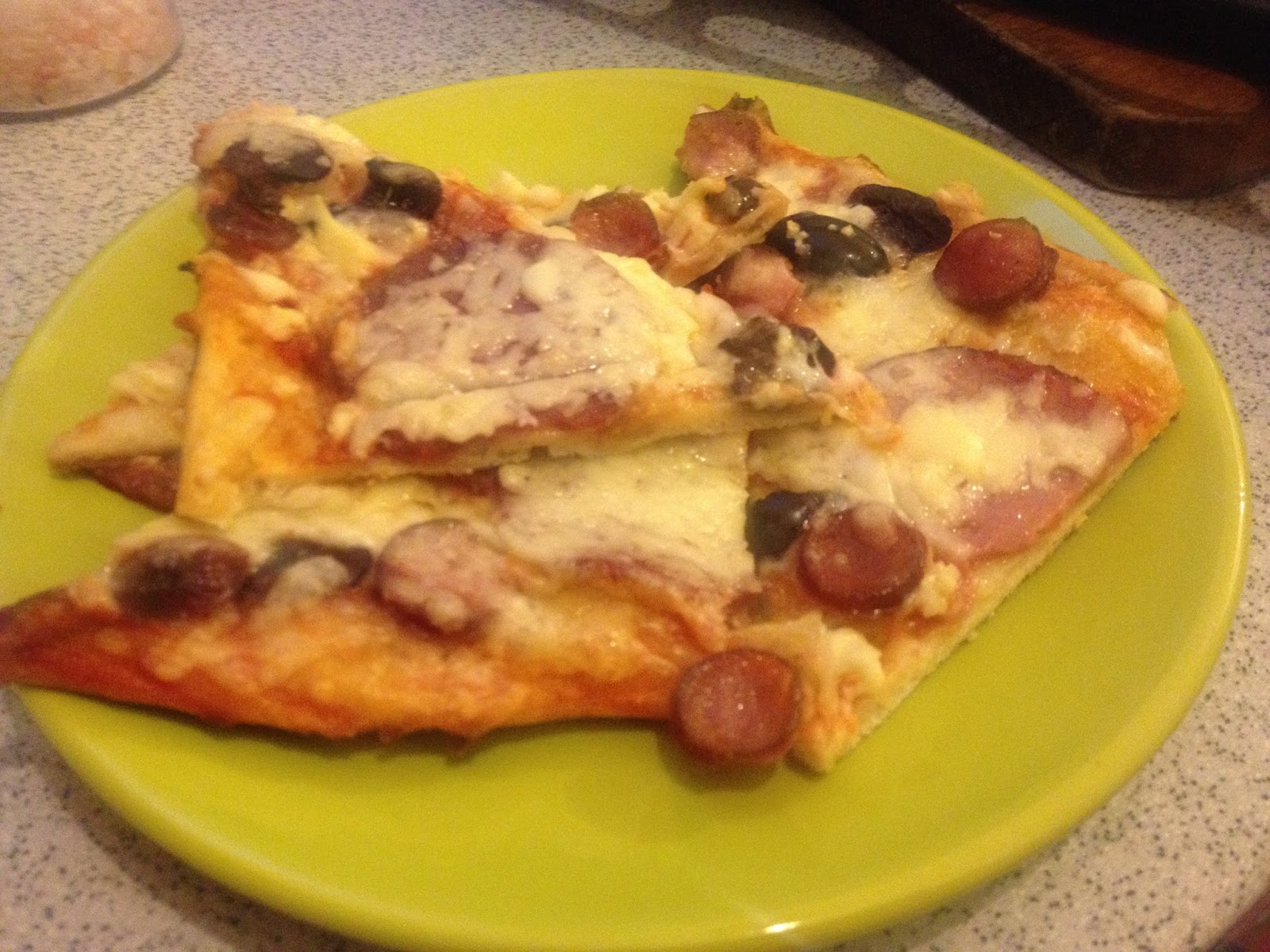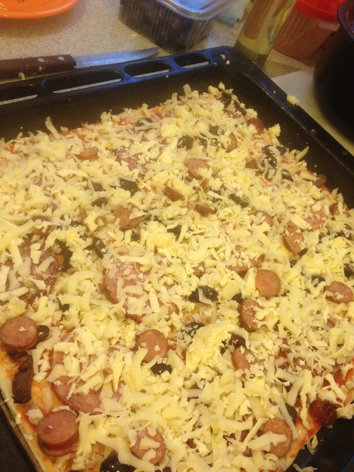 Am dezghetat blatul de pizza cumparat, am spreiat tava cu putin ulei si am pus blatul in tava, am spreiat un pic de ulei si peste blat si am pus deasupra sos de rosii amestecat cu putina boia dulce afumata.