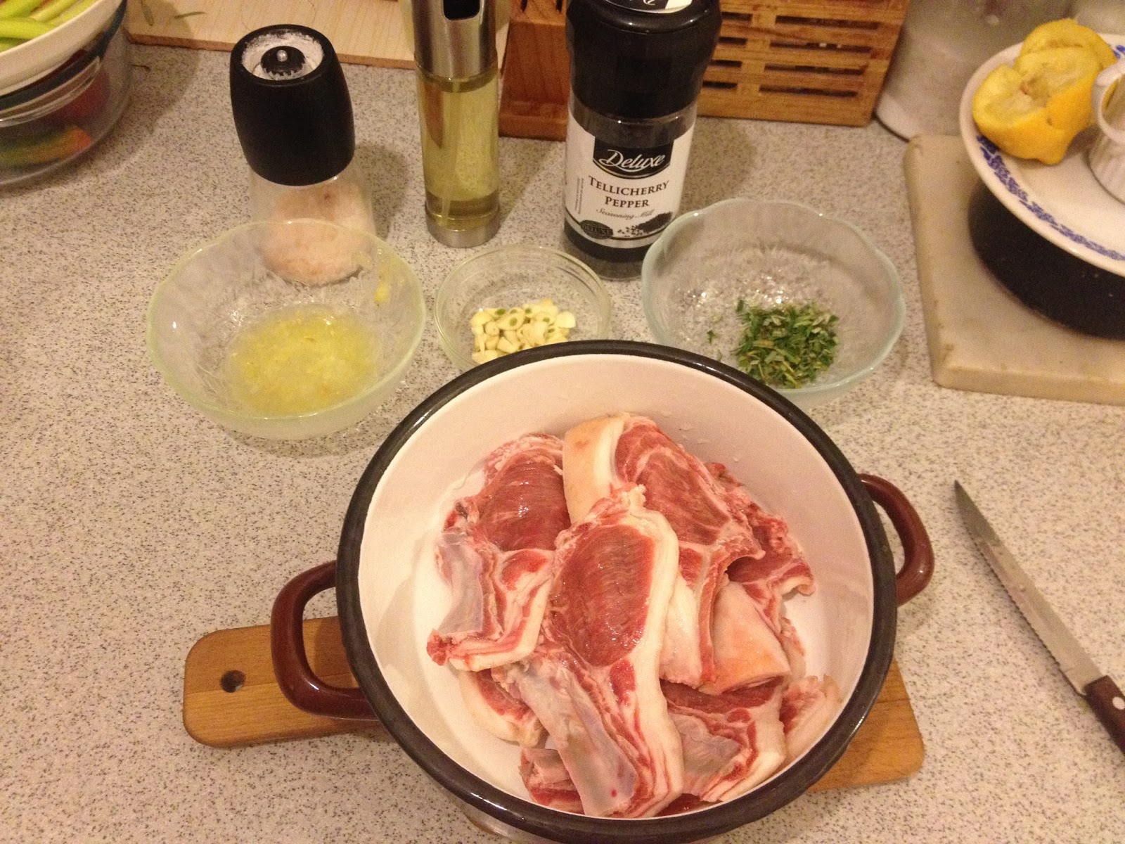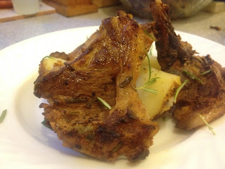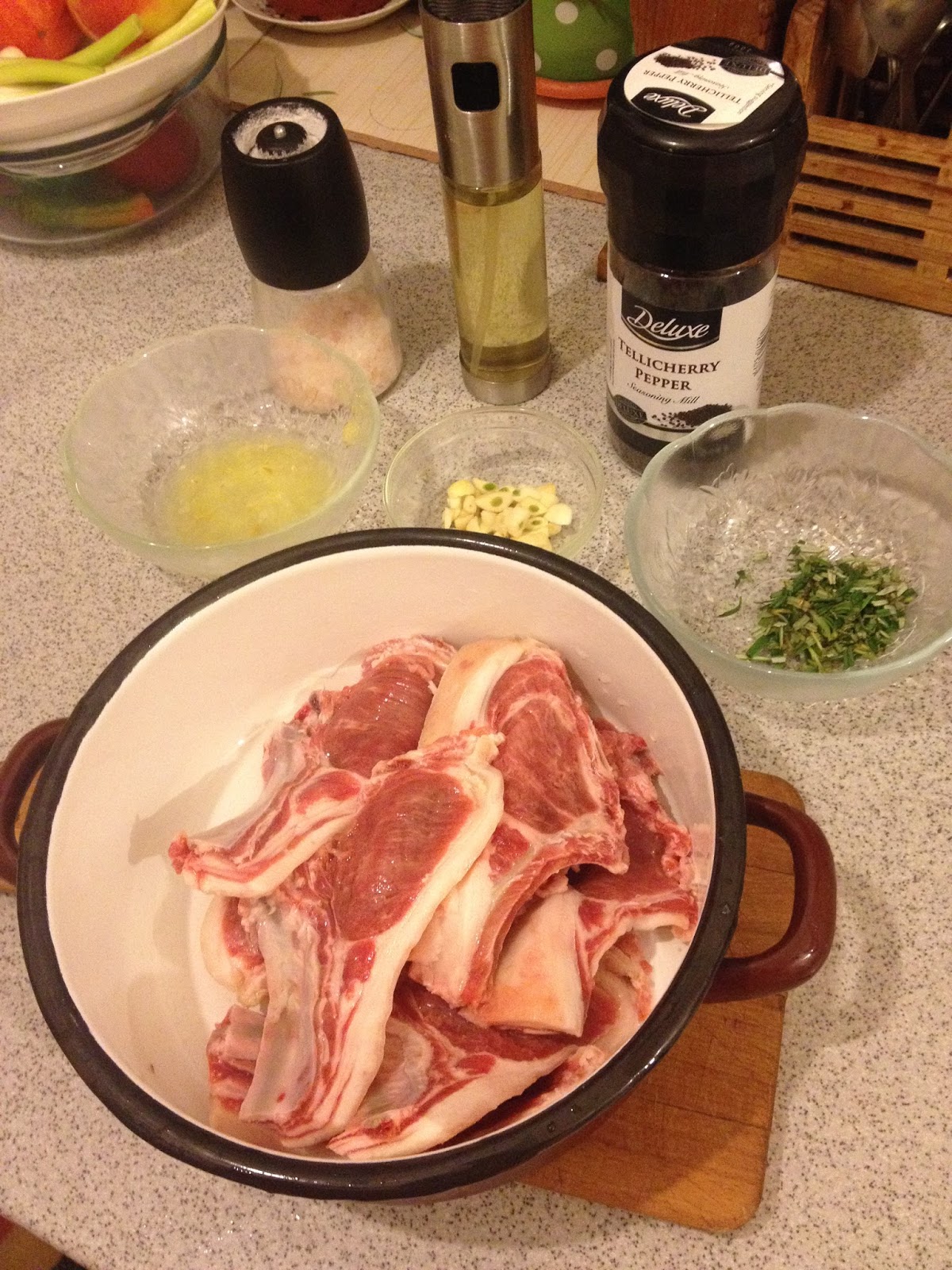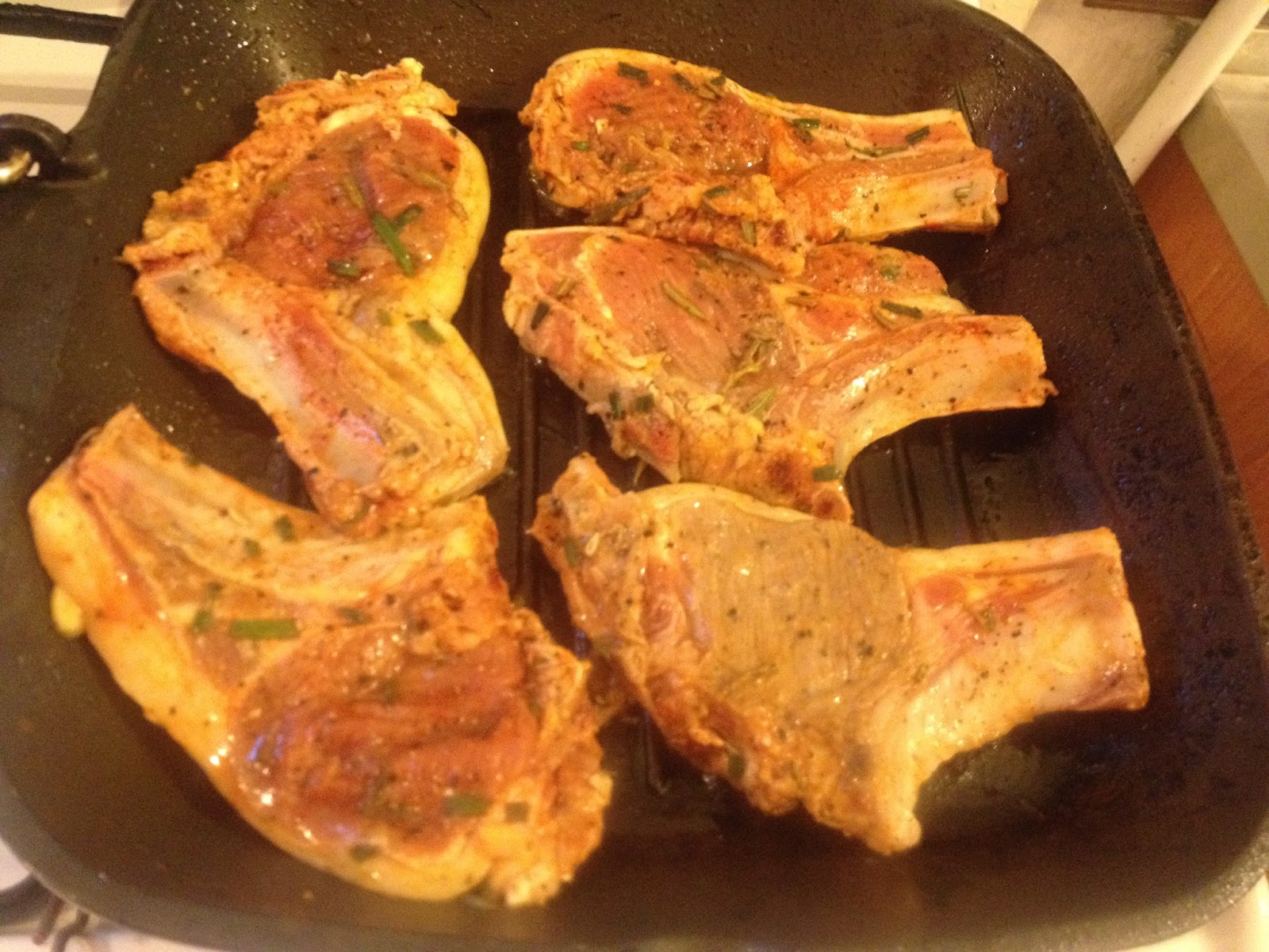 Cu o zi inainte de a gati berbecutul, am pus cotletele la marinat asa: am facut un amestec din putin ulei de masline, sare mare, piper, rozmarin verde tocat marunt (am in ghiveci), usturoi, zeama de la o lamaie, boia dulce afumata si un pic de vin alb sec.