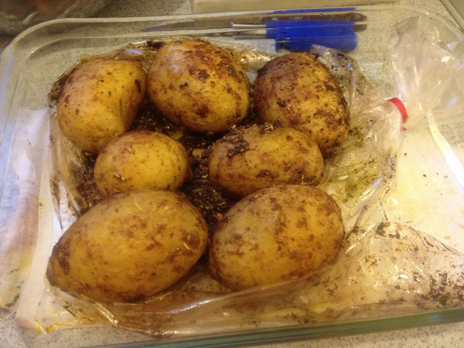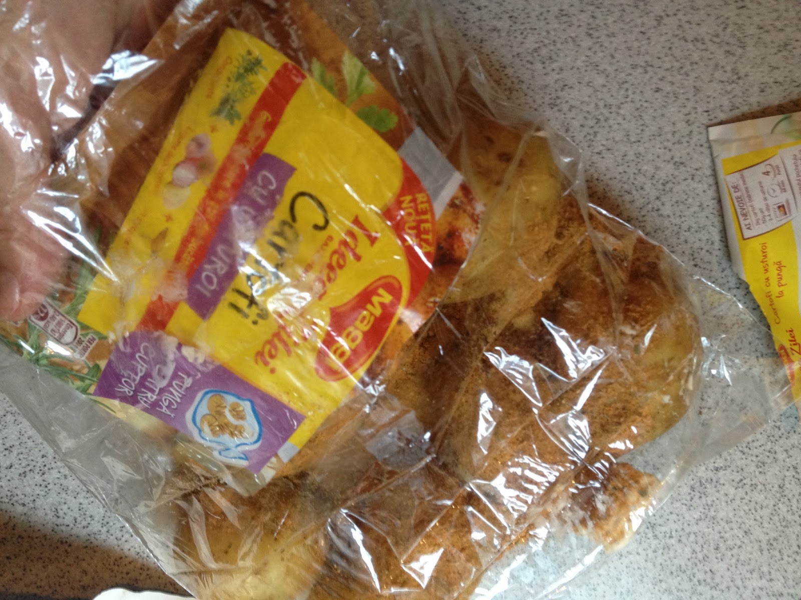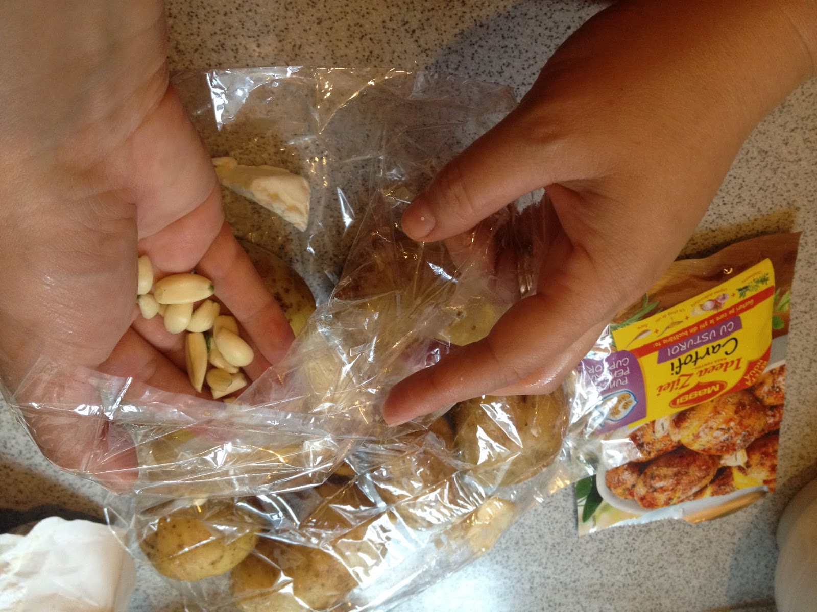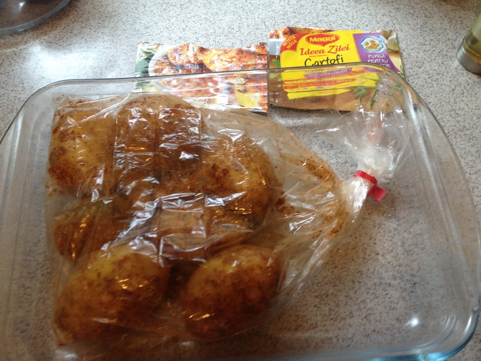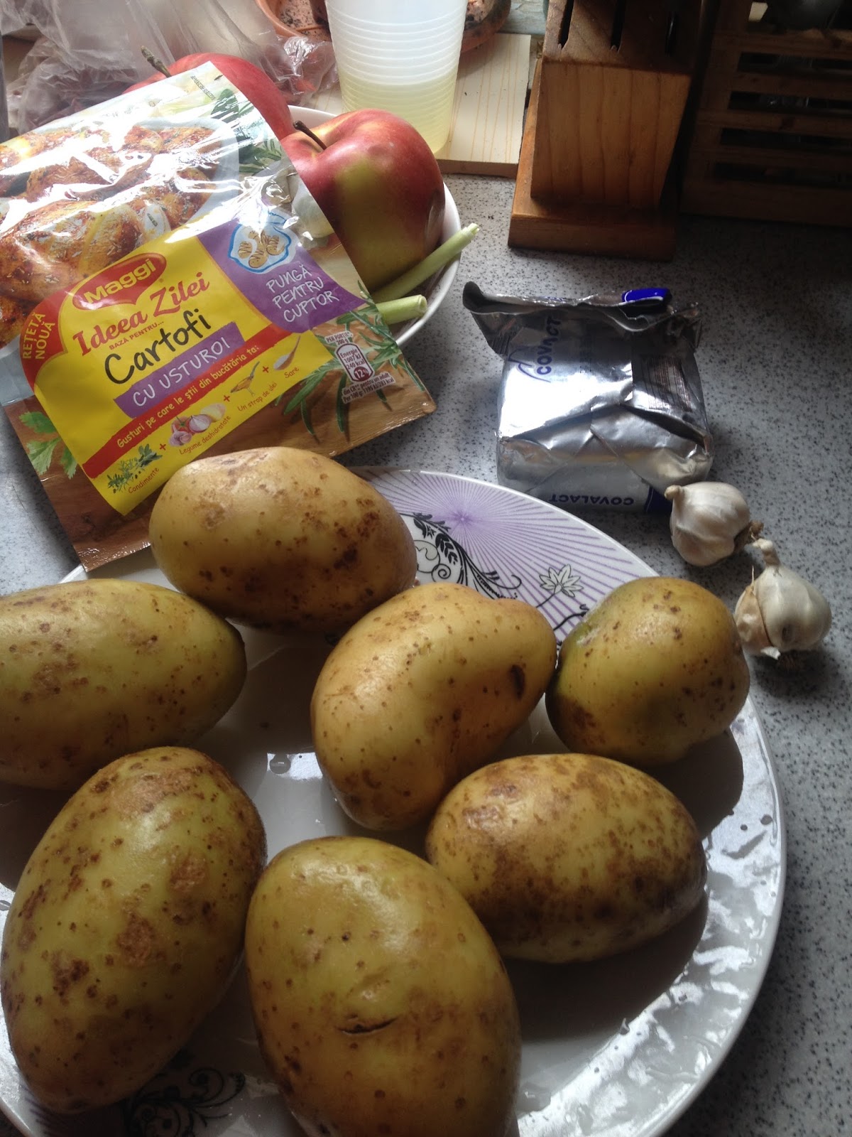 Cartofii, i-am spalat bine, bine si i-am pregatit dupa instructiunile din plicul Maggi, am avut nevoie suplimentar de usturoi si unt.