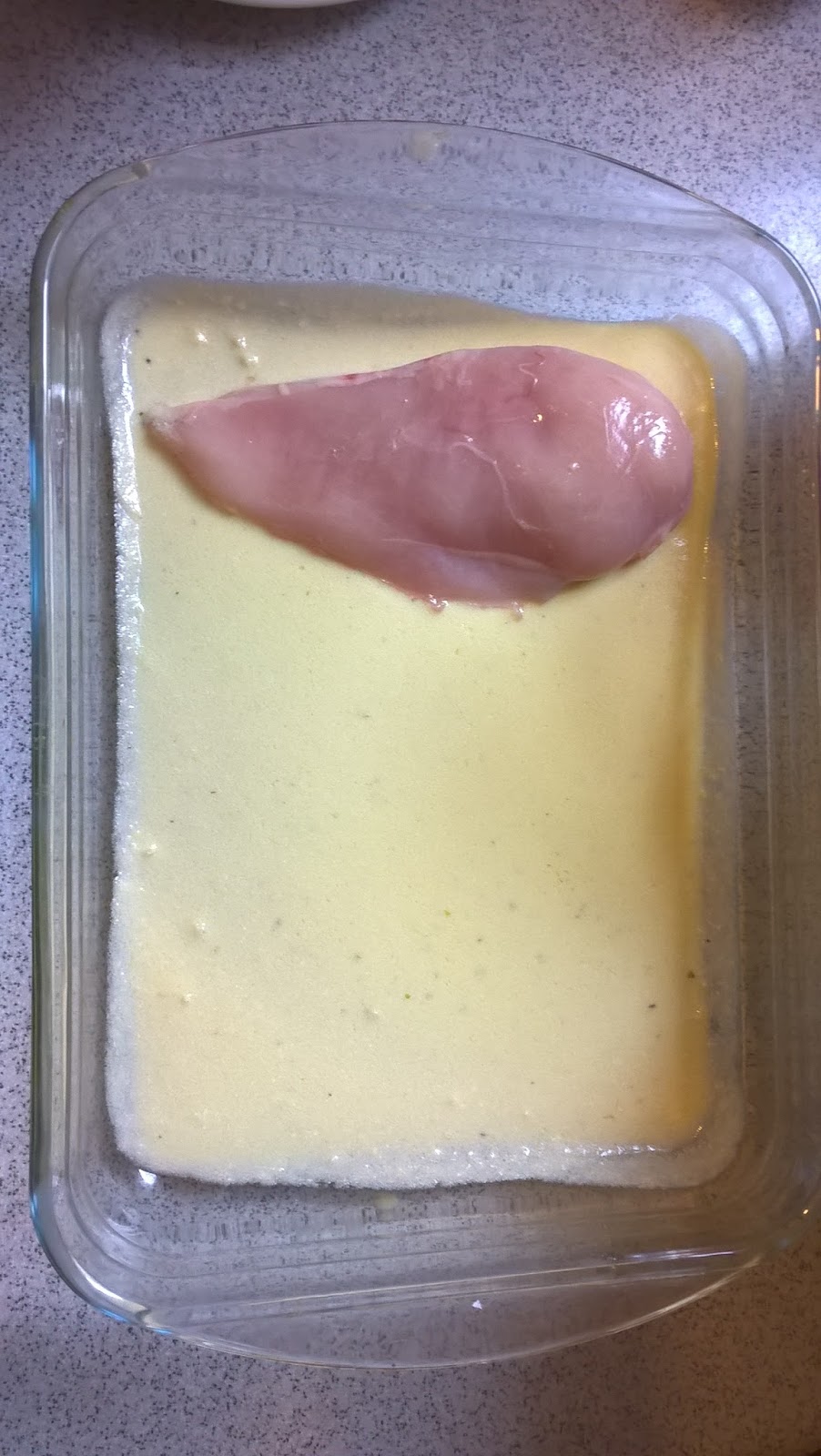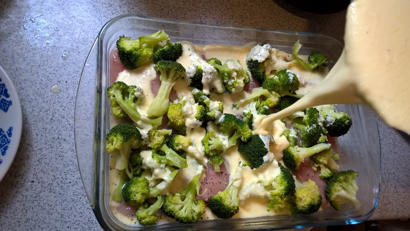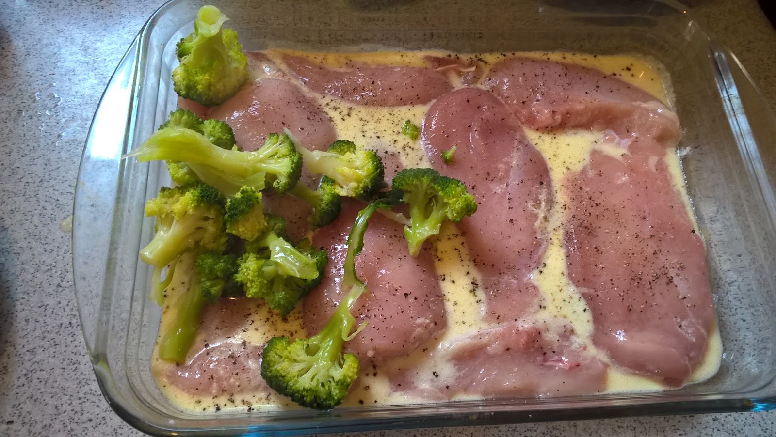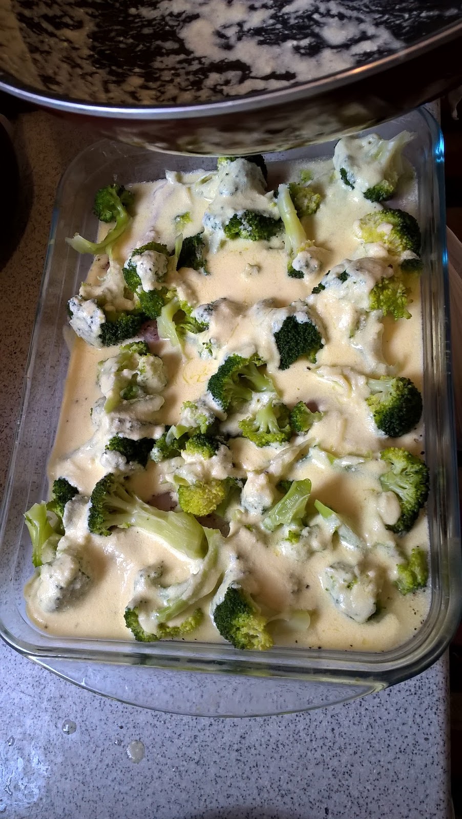 Intr-un vas de yena, am turnat sosul Alfredo, apoi am pus pieptul de pui, Am adaugat broccoli, apoi am turnat din nou sos Alfredo. Am potrivit de sare si piper.