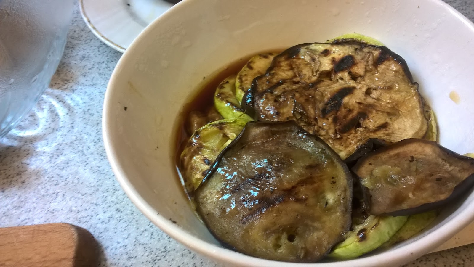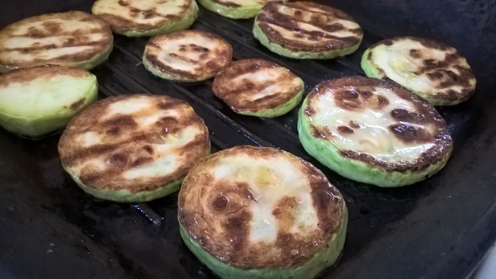 Clatiti-le bine pentru a îndeparta excesul de sare ( eu am pus totusi cam multa, nu le inecati in sare ) si se lasa la scurs. Se spala bine ardeii, se scot semințele si se taie in bucați mari ( eu nu am citit bine si i-am taiat in felii subtiri, nu s-a intamplat nimic grav). Se pune o tigaie grill pe foc, cu un pic de ulei de masline si usturoi ( eu am presarat usturoi praf, direct in salata). Se coc legumele pe ambele laturi.