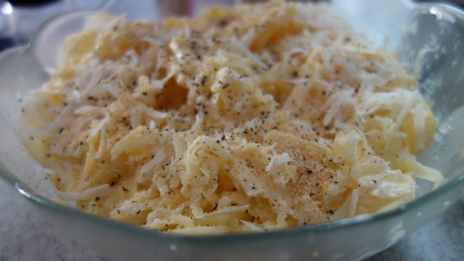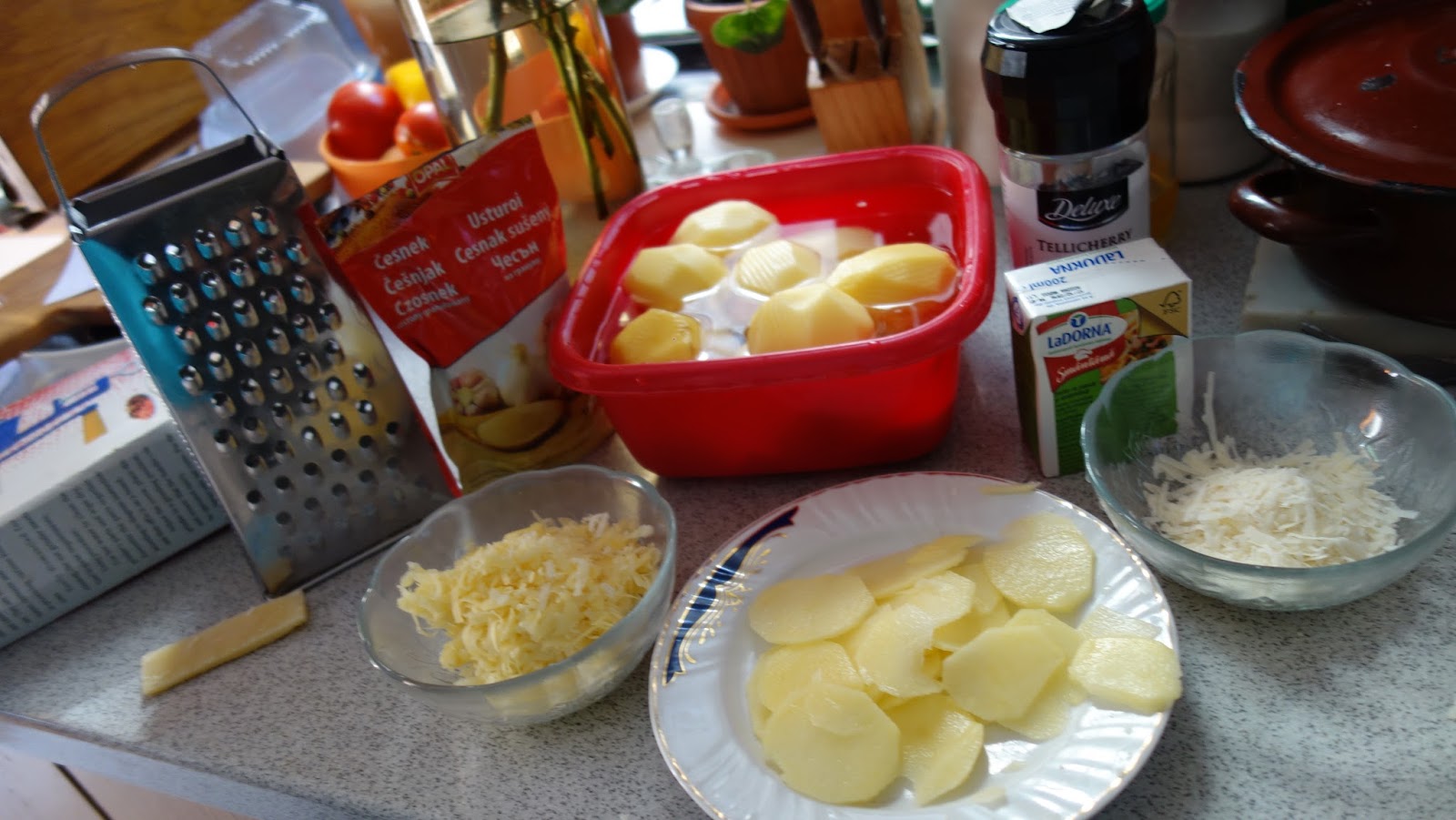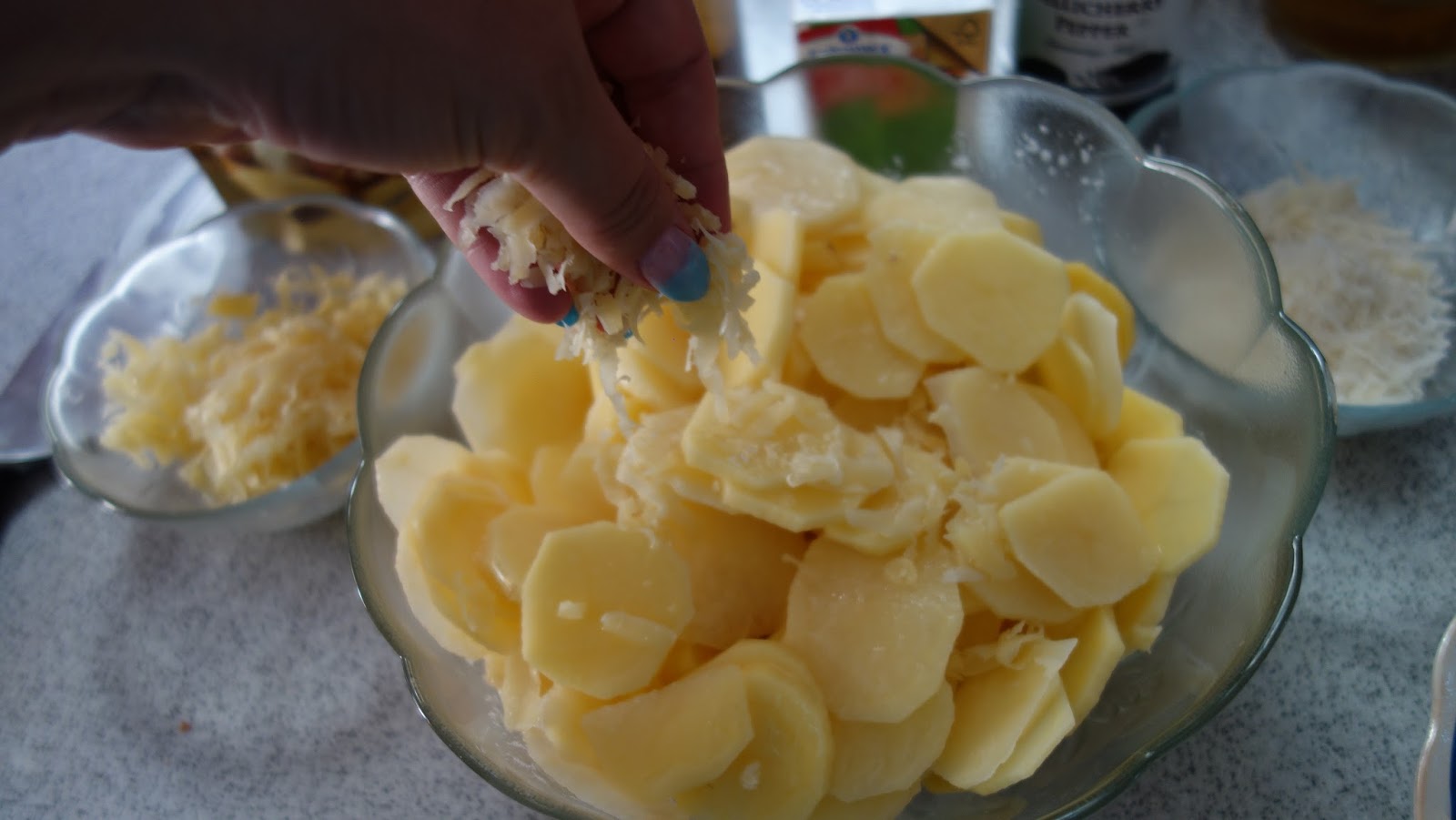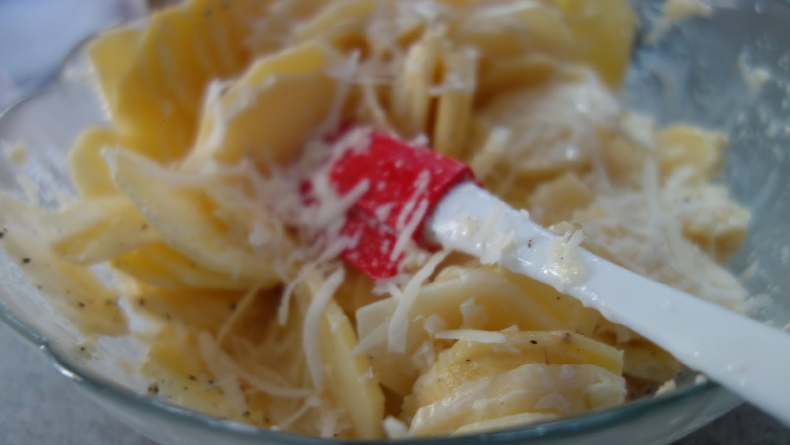 Peste feliile de cartofi, am turnat untul topit, cascavalul ras, apoi sare, piper proaspat macinat, parmezan dat prin razatoare si smantana pentru gatit.