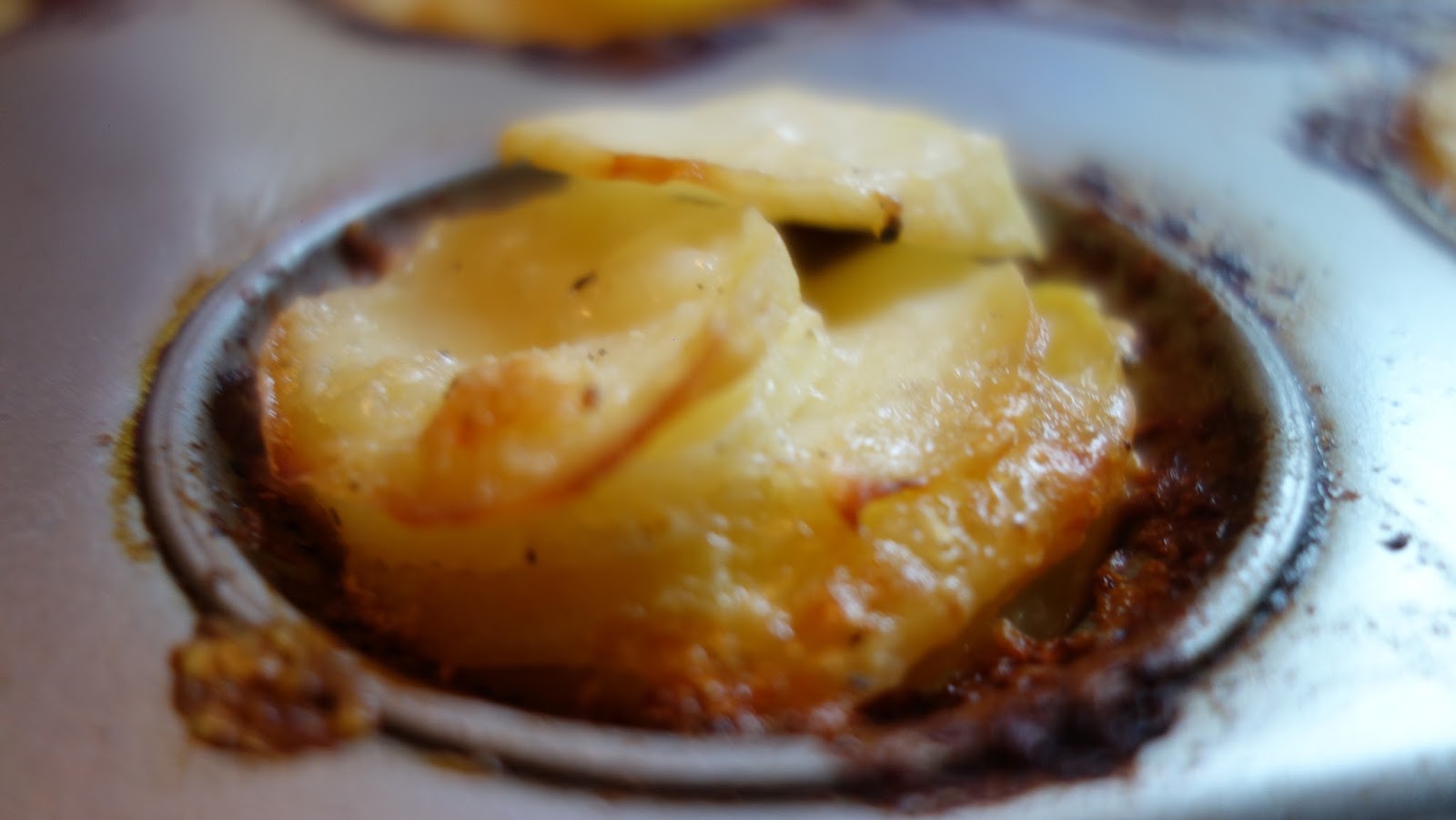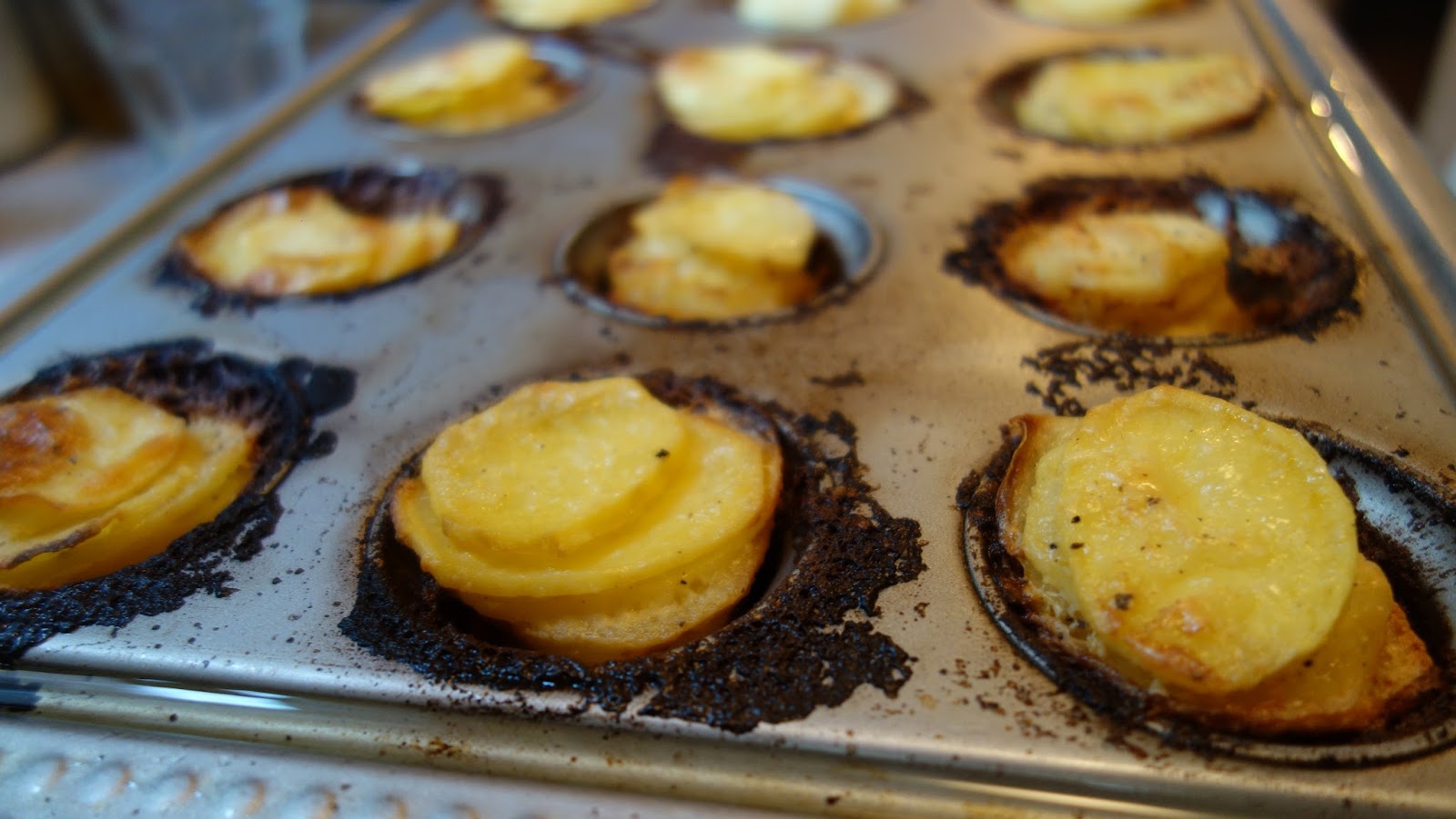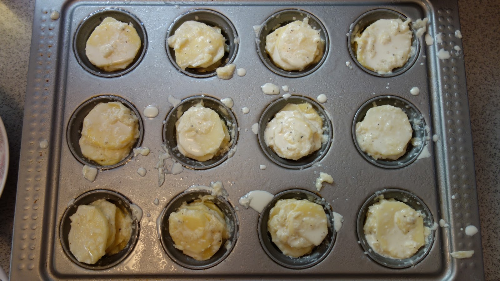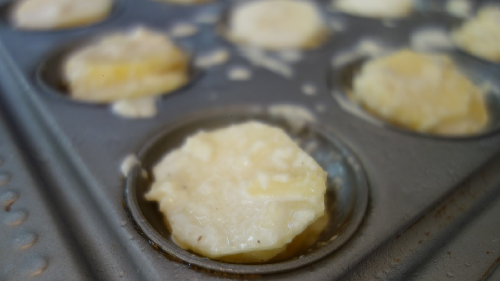 Se taie cartofii feliute subtiri. Trebuie sa aveti o tava, o sa vedeti in filmuletul original cum arata, eu am avut una pentru briose, dar nu a fost buna, cupele fiind prea lungi si subtiri. Ar fi fost buna o tava cu aceste cupe mai mici si mai largute, ca sa incapa felia de cartof mai bine.