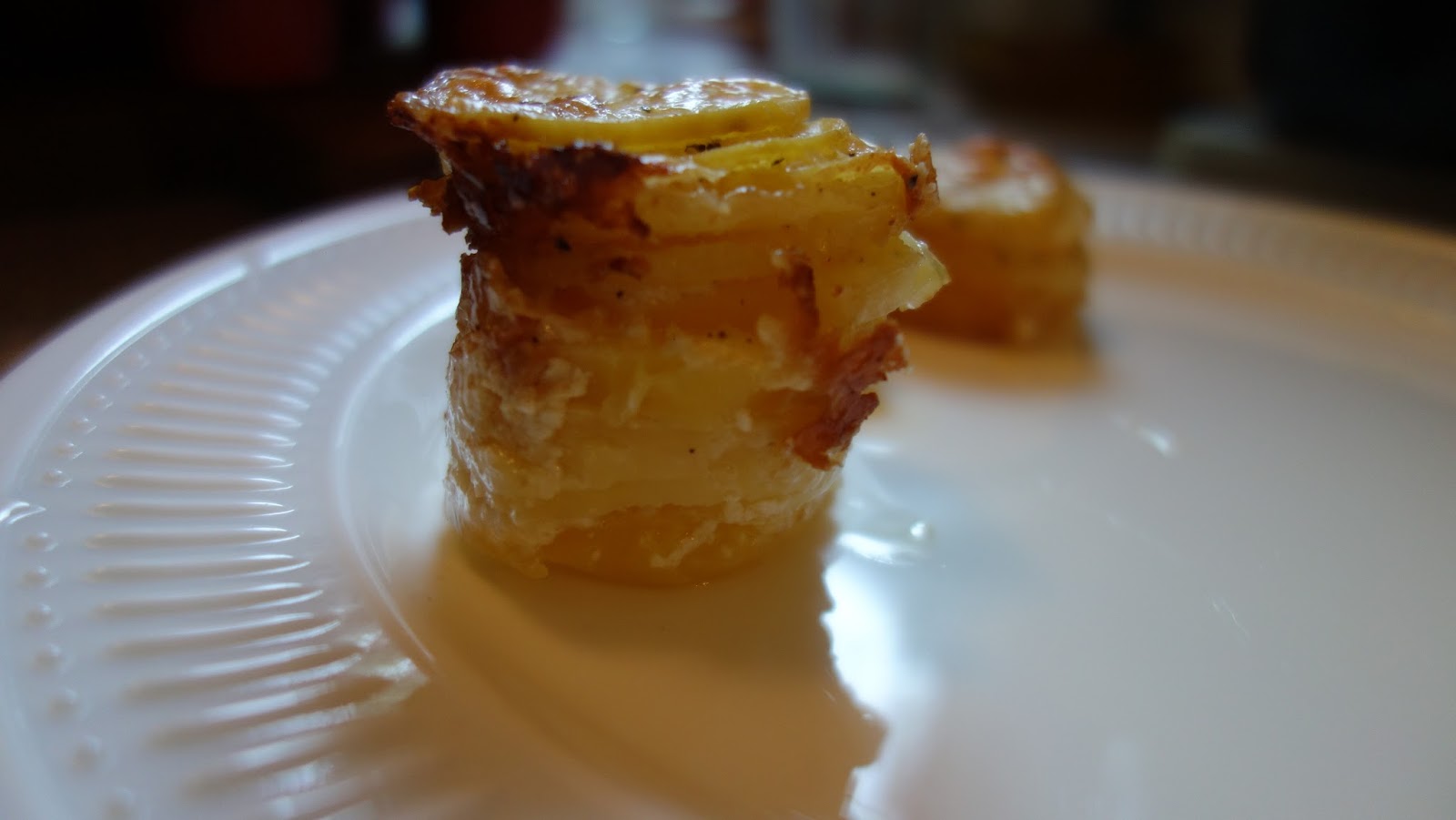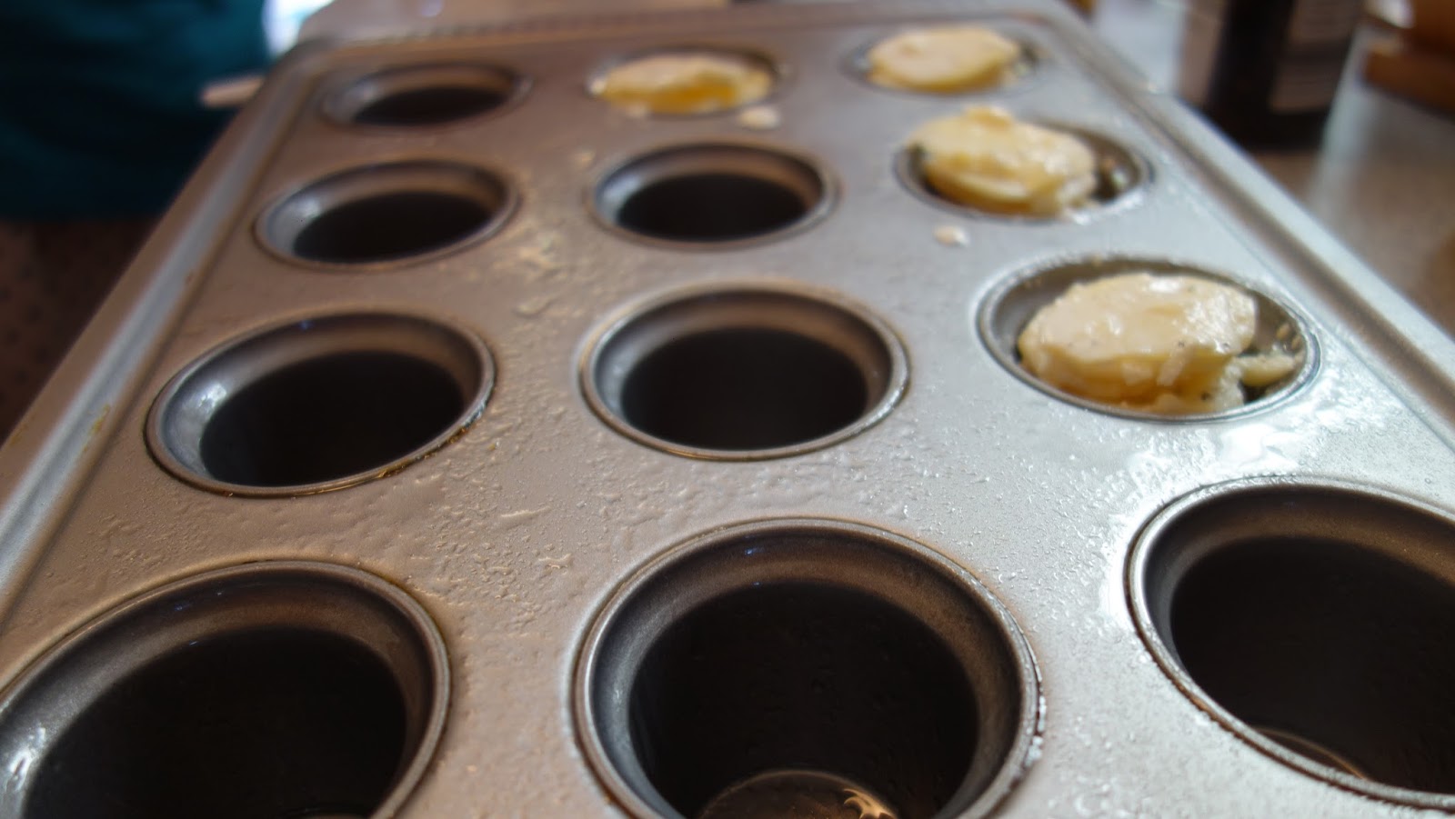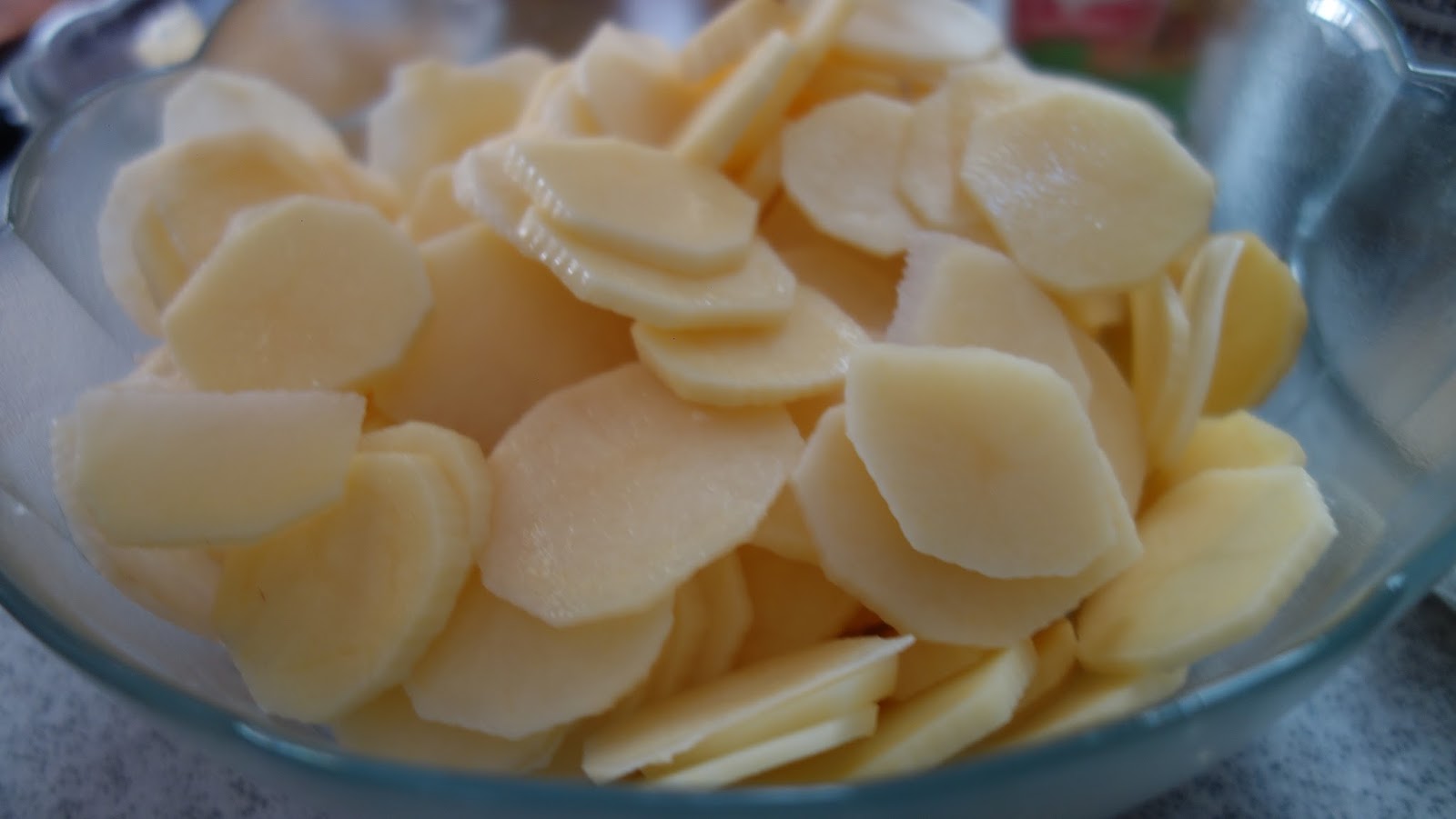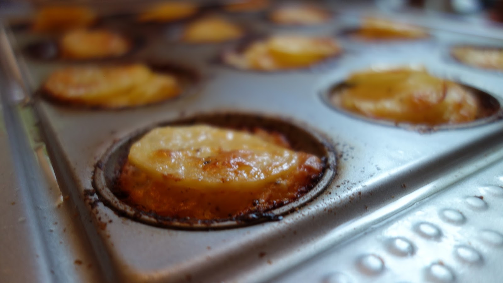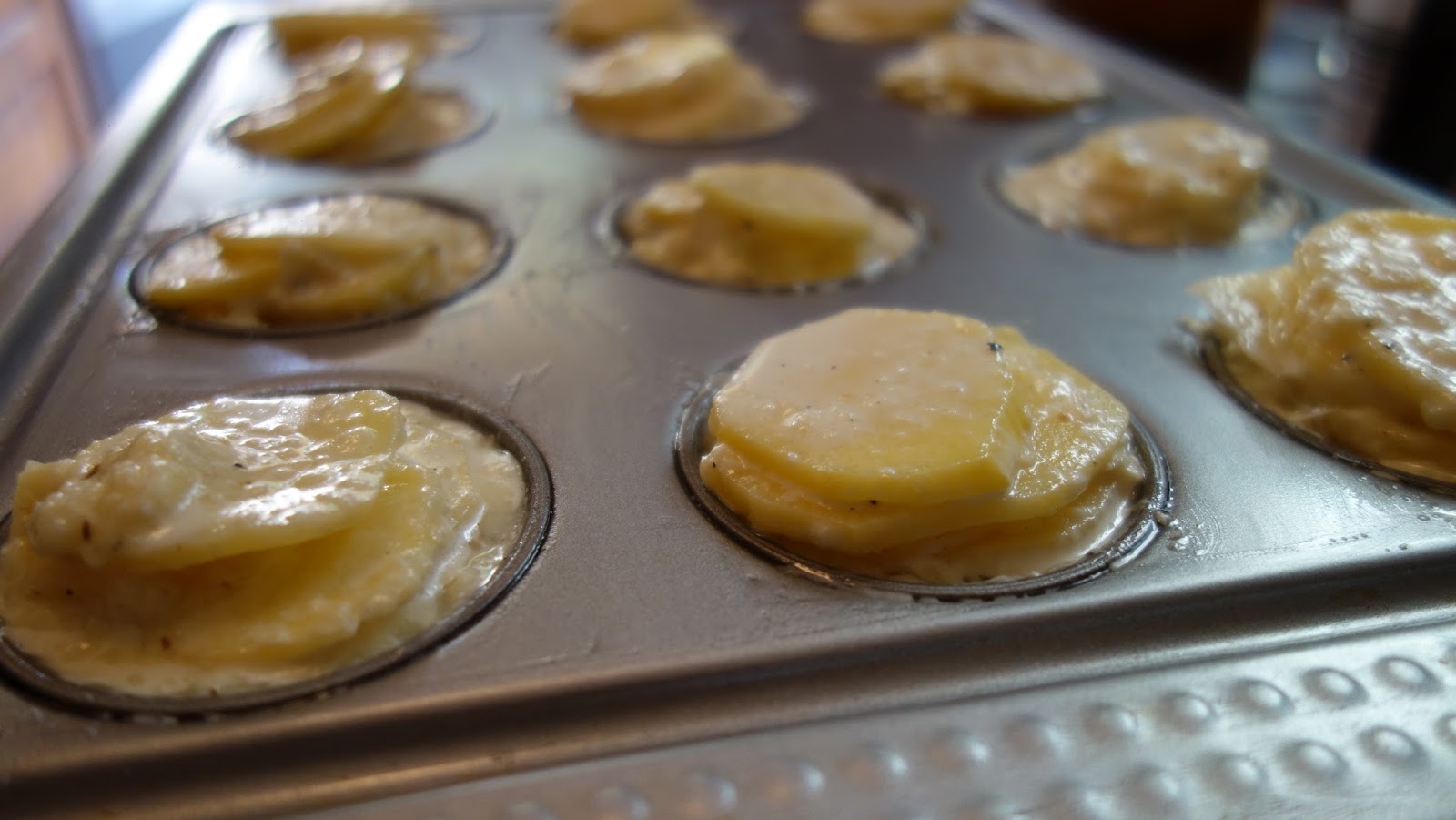 Se taie cartofii feliute subtiri. Trebuie sa aveti o tava, o sa vedeti in filmuletul original cum arata, eu am avut una pentru briose, dar nu a fost buna, cupele fiind prea lungi si subtiri. Ar fi fost buna o tava cu aceste cupe mai mici si mai largute, ca sa incapa felia de cartof mai bine.