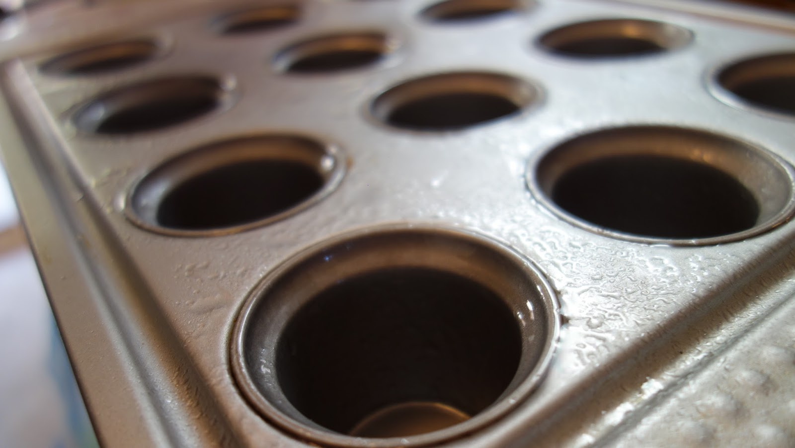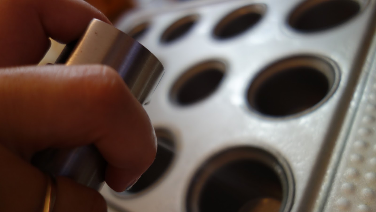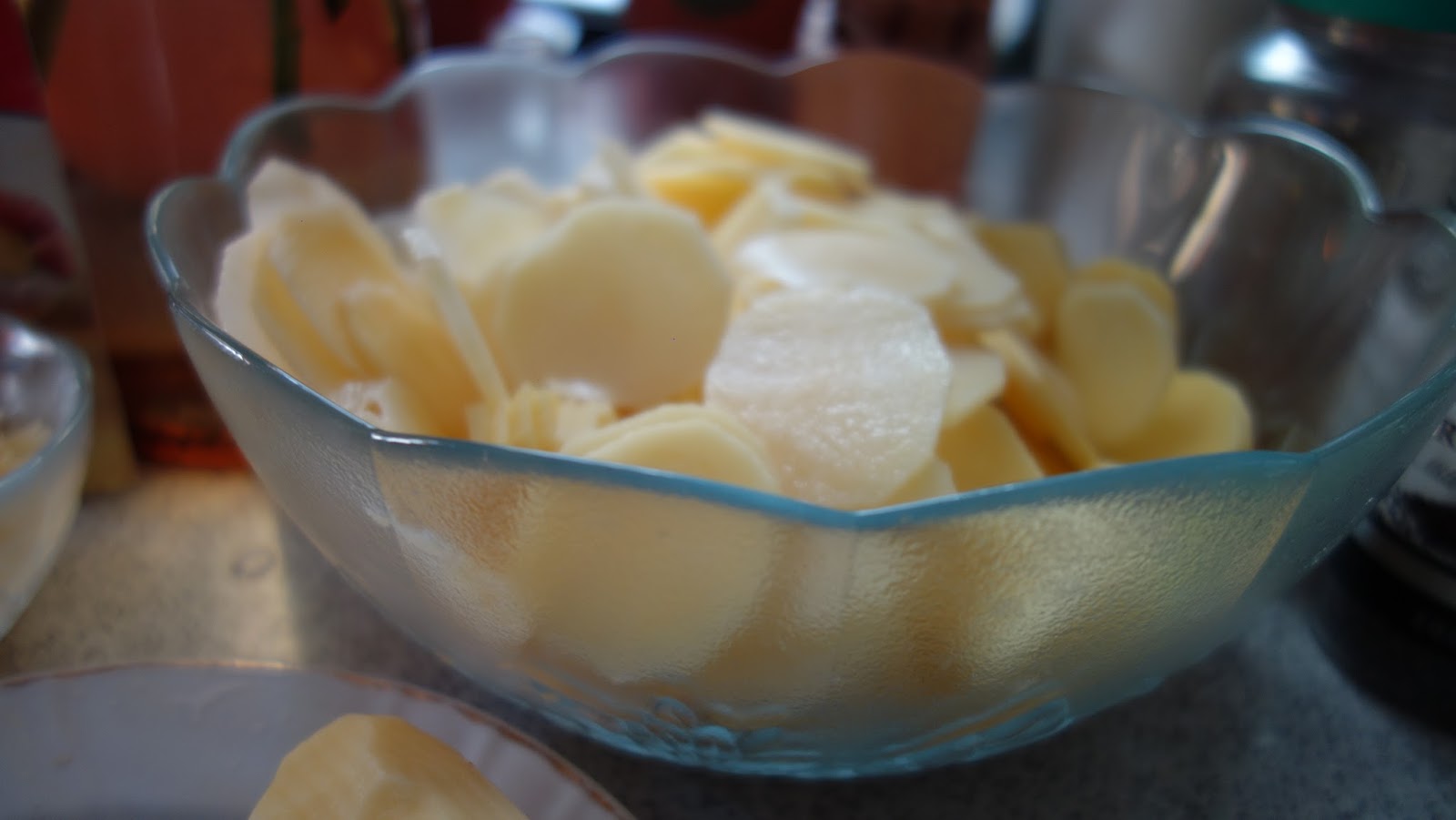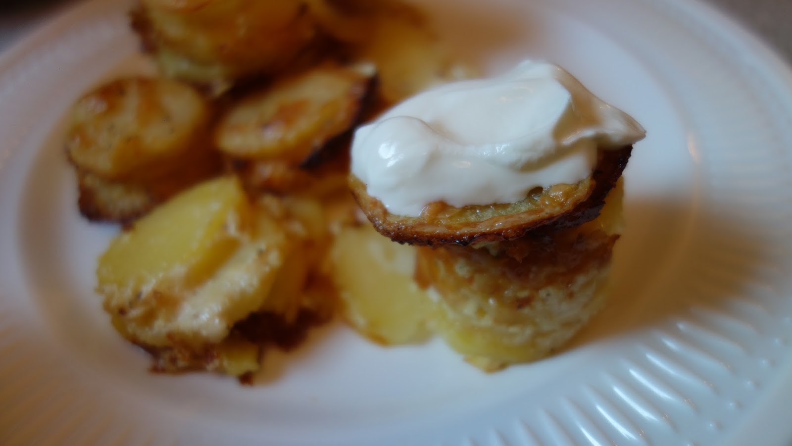Se taie cartofii feliute subtiri. Trebuie sa aveti o tava, o sa vedeti in filmuletul original cum arata, eu am avut una pentru briose, dar nu a fost buna, cupele fiind prea lungi si subtiri. Ar fi fost buna o tava cu aceste cupe mai mici si mai largute, ca sa incapa felia de cartof mai bine.