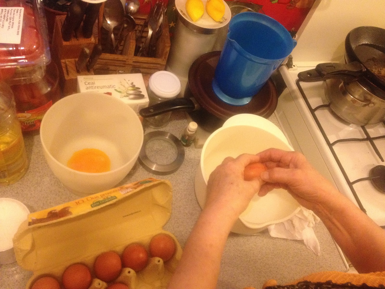 Albusurile se bat spuma, se adauga zaharul in ploaie, apoi se incorporeaza faina, dar nu o mai amestecam cu mixerul ci manual, cu o lingura de lemn. Se adauga galbenusurile frecate cu sare si un pahar de ulei, tot asa, treptat, apoi o lingurita de bicarbonat stins cu zeama de lamaie sau otet. Se toarna aluatul in forme.