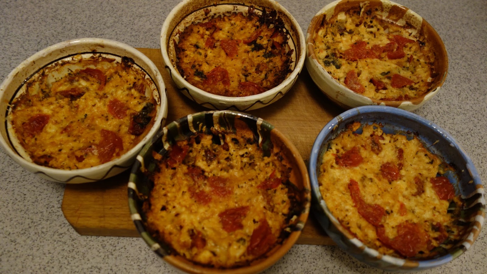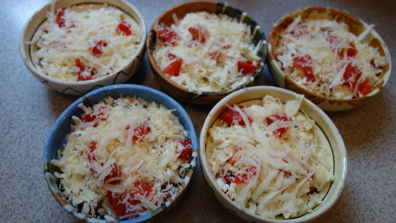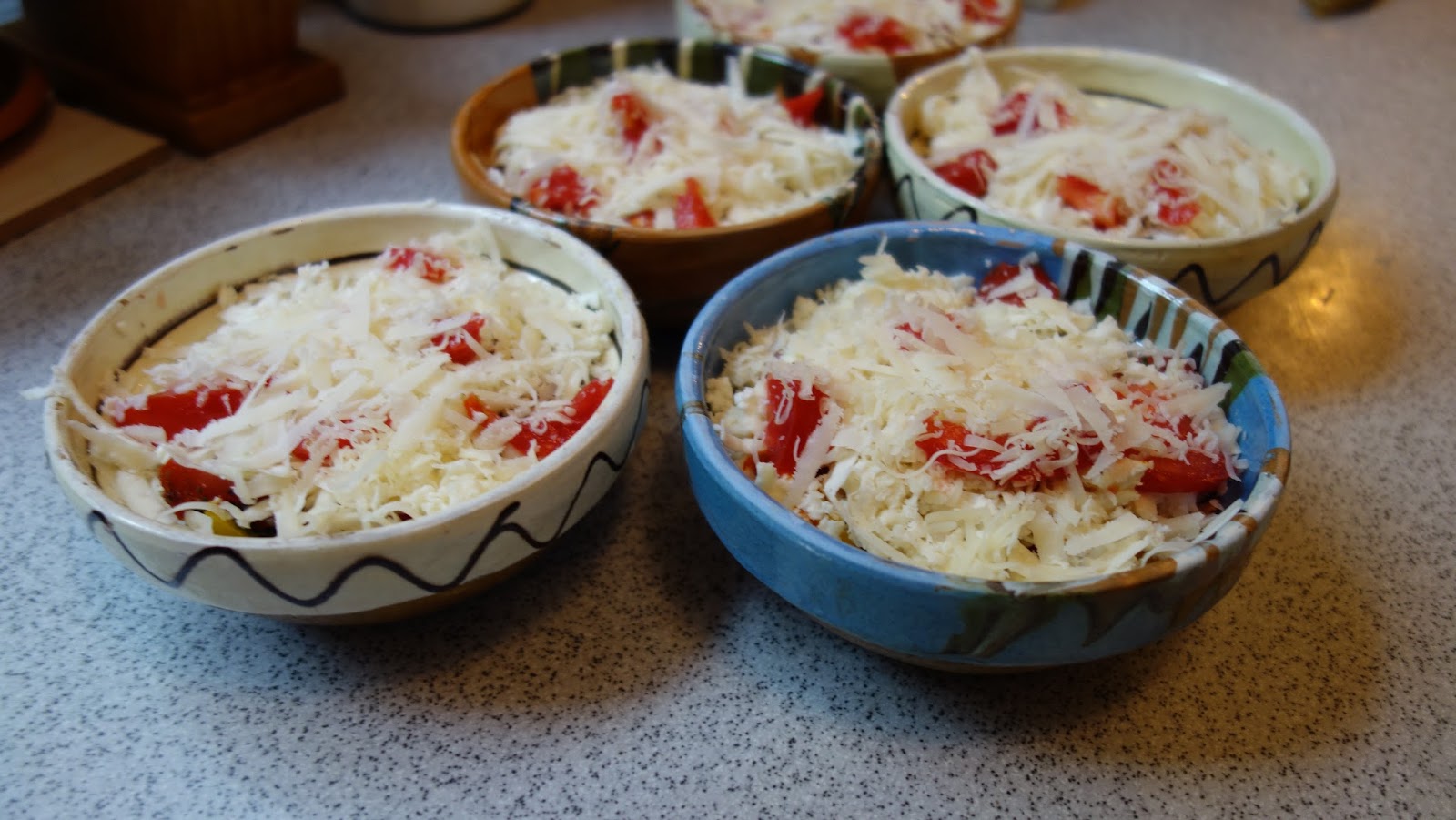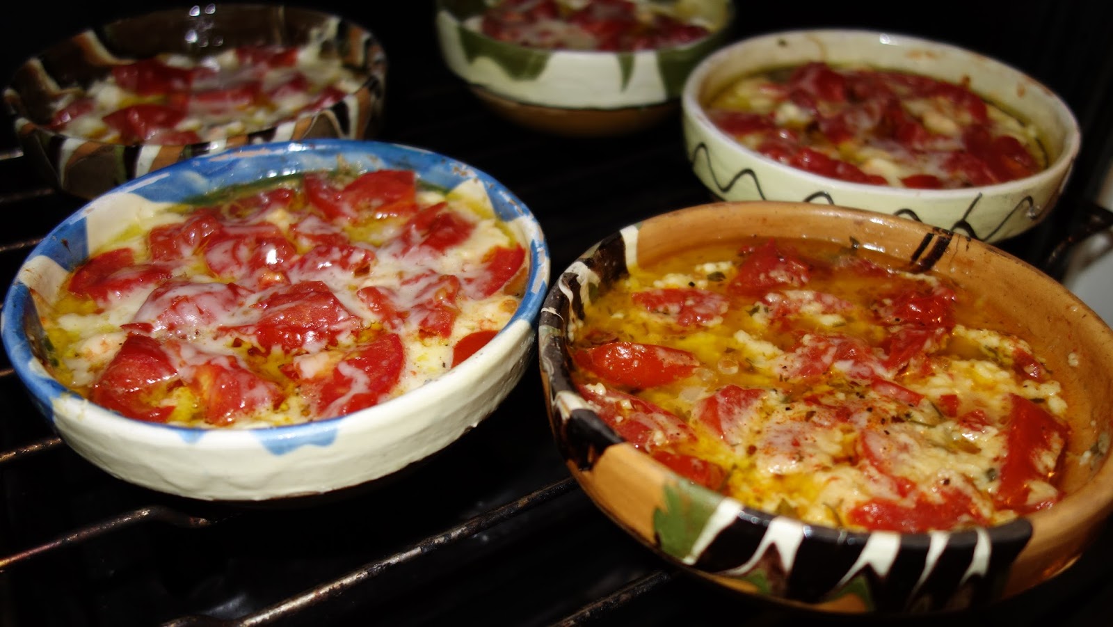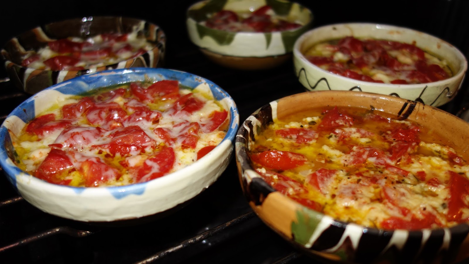 ividuale, se aseaza totul in straturi: branza, rosiile, ardeiul gras, patrunjelul, boiaua, uleiul de masline, piperul proaspat macinat, oregano uscat sau proaspat, sucul de la rosii se pune si el, chili, apoi eu am mai pus un rand de branza telemea zdrobita, un rand de rosii si am presarat cascaval pe deasupra si putin parmezan, foarte putin.