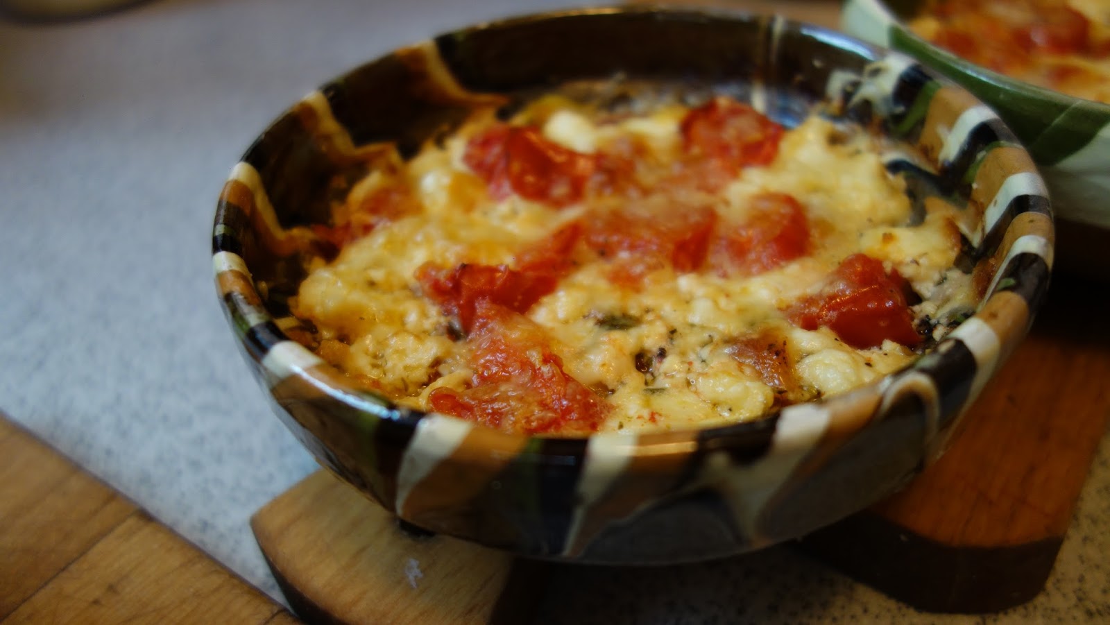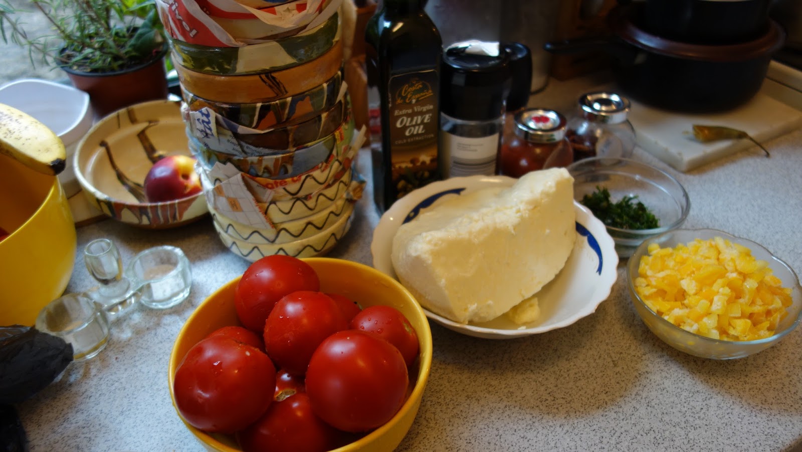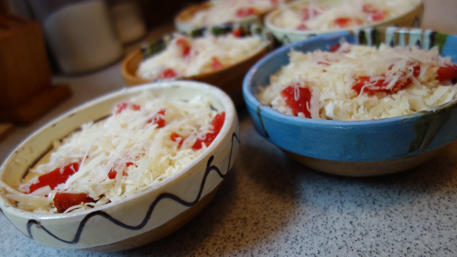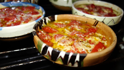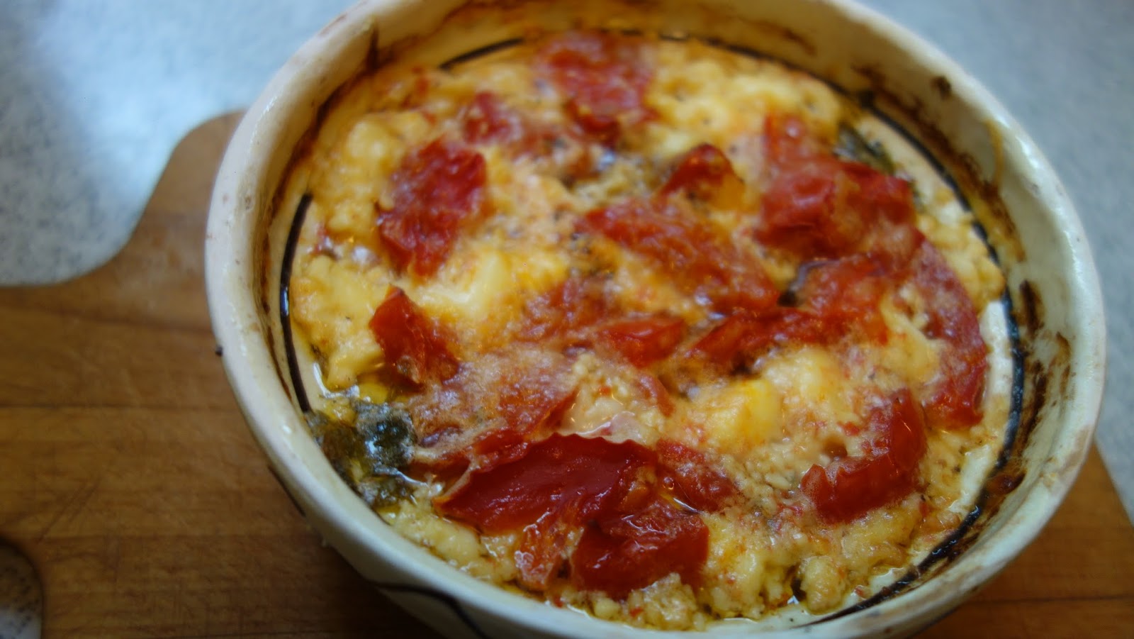 ividuale, se aseaza totul in straturi: branza, rosiile, ardeiul gras, patrunjelul, boiaua, uleiul de masline, piperul proaspat macinat, oregano uscat sau proaspat, sucul de la rosii se pune si el, chili, apoi eu am mai pus un rand de branza telemea zdrobita, un rand de rosii si am presarat cascaval pe deasupra si putin parmezan, foarte putin.