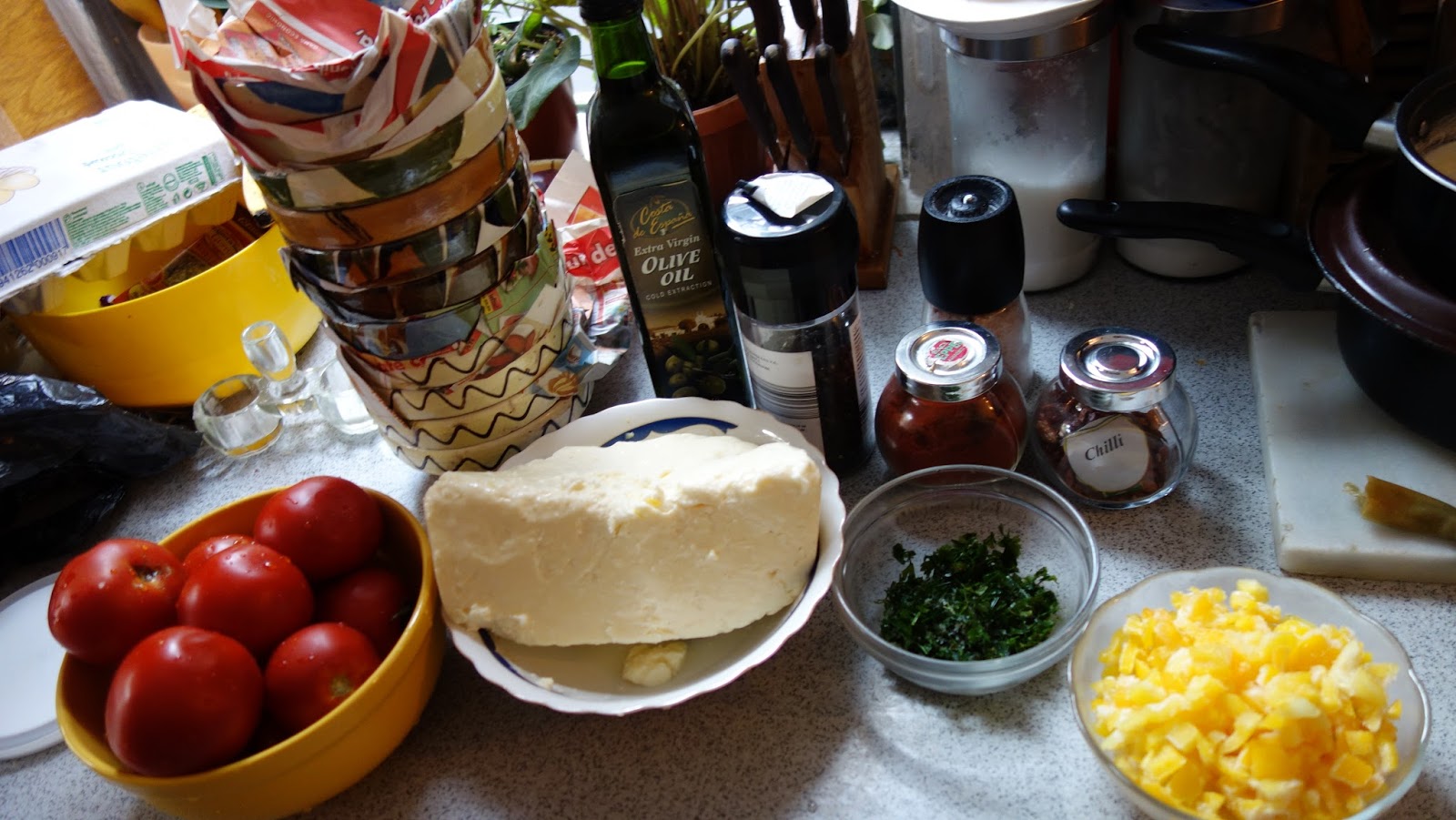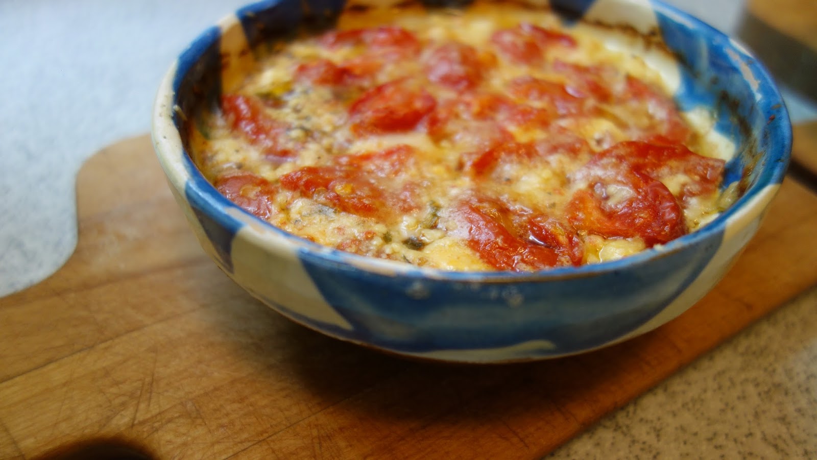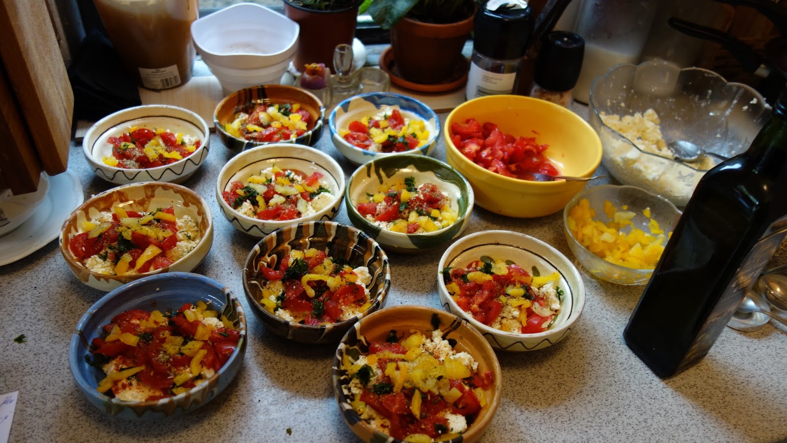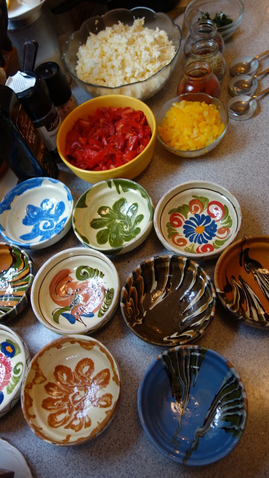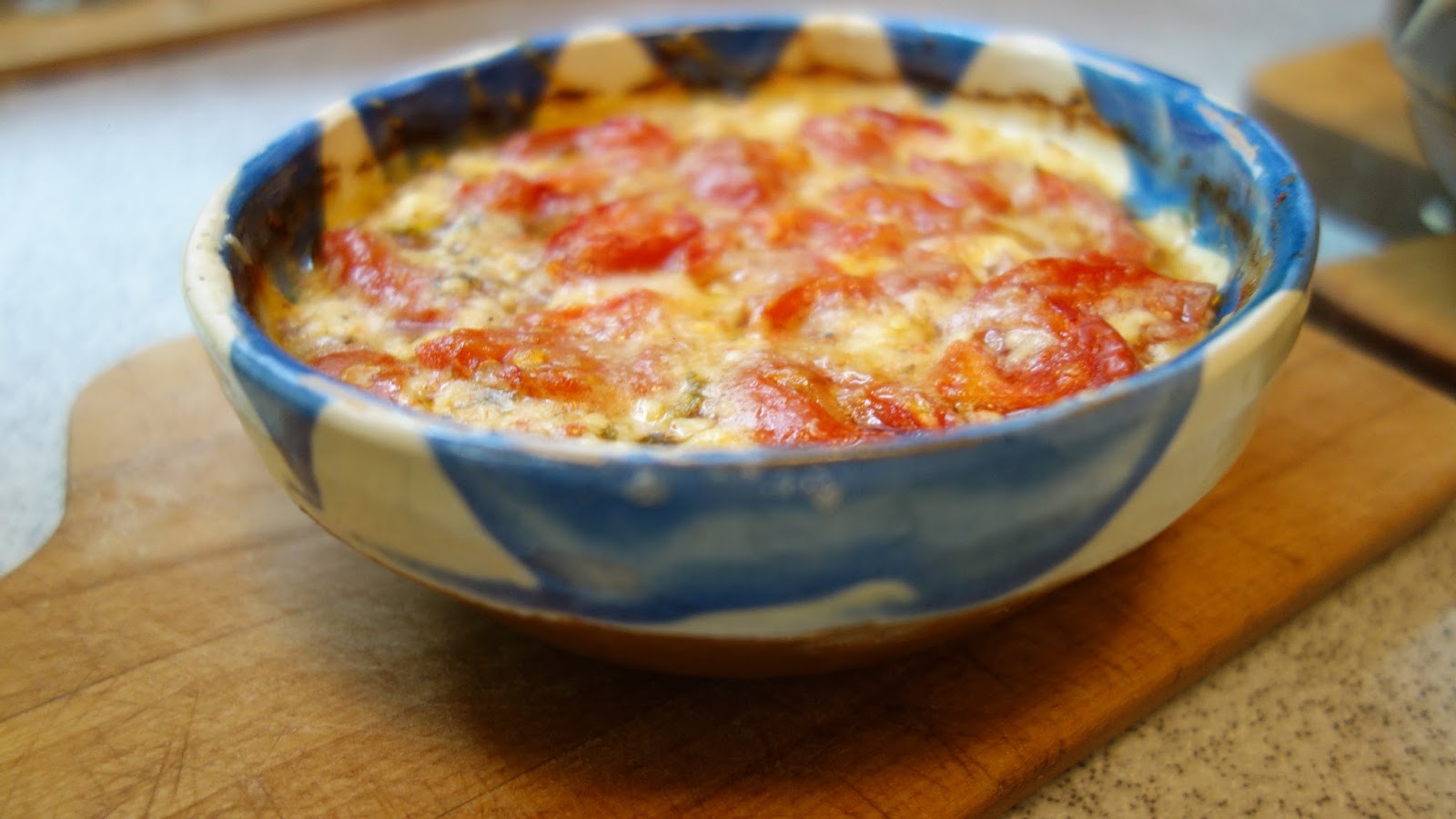 ividuale, se aseaza totul in straturi: branza, rosiile, ardeiul gras, patrunjelul, boiaua, uleiul de masline, piperul proaspat macinat, oregano uscat sau proaspat, sucul de la rosii se pune si el, chili, apoi eu am mai pus un rand de branza telemea zdrobita, un rand de rosii si am presarat cascaval pe deasupra si putin parmezan, foarte putin.