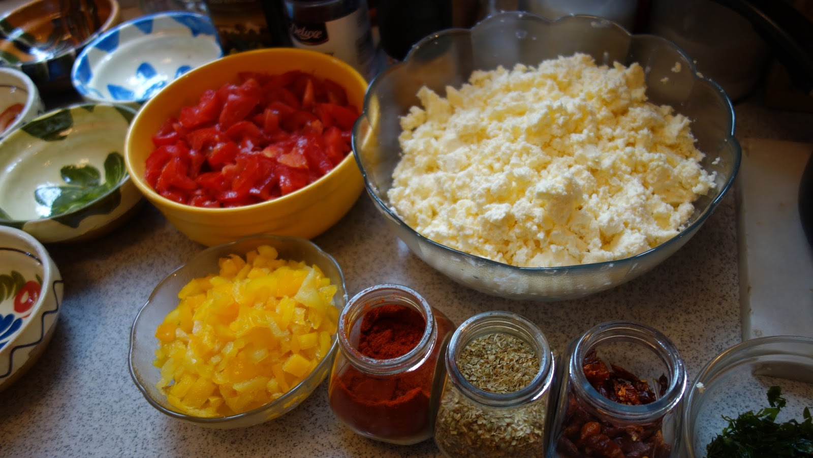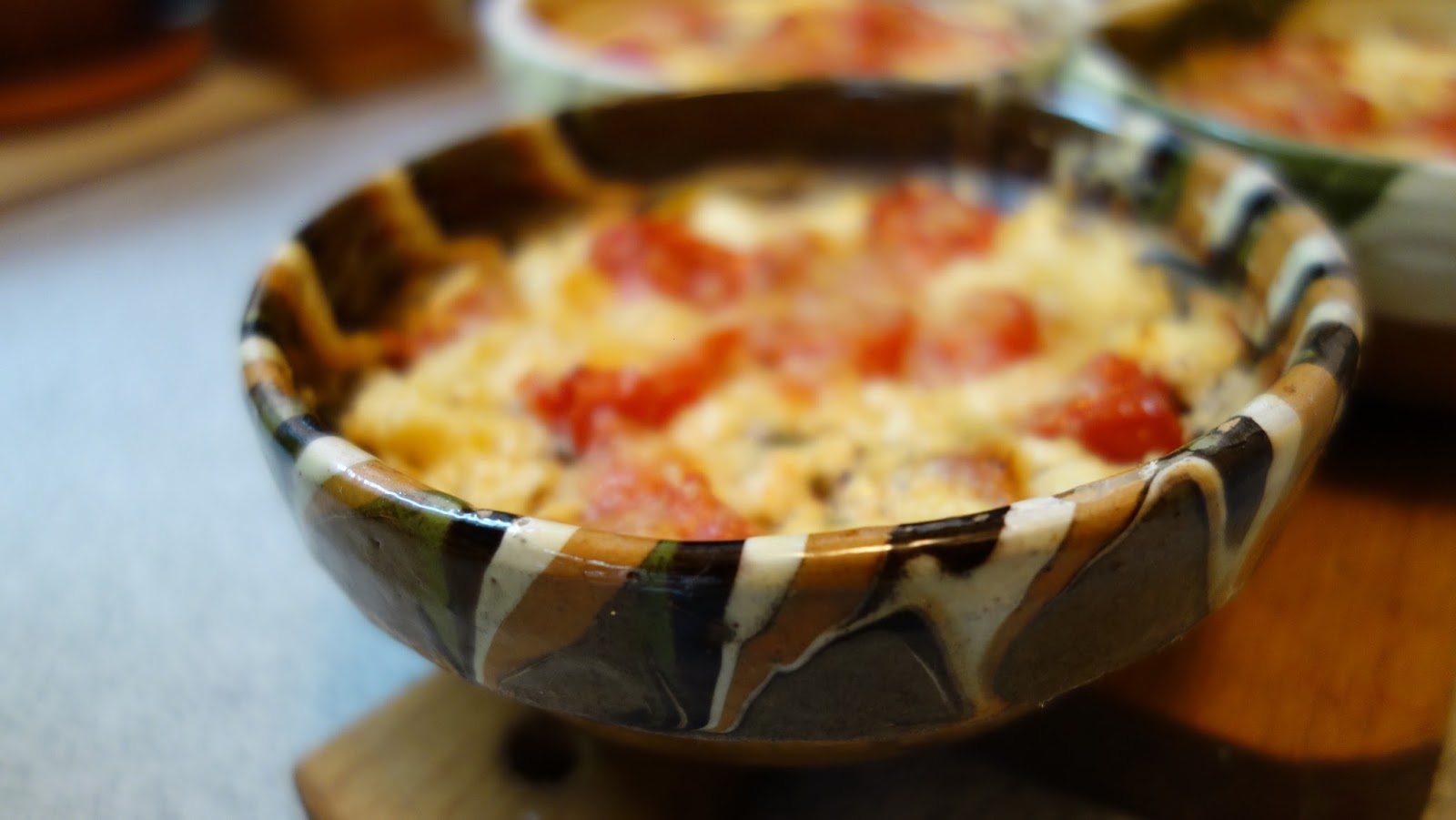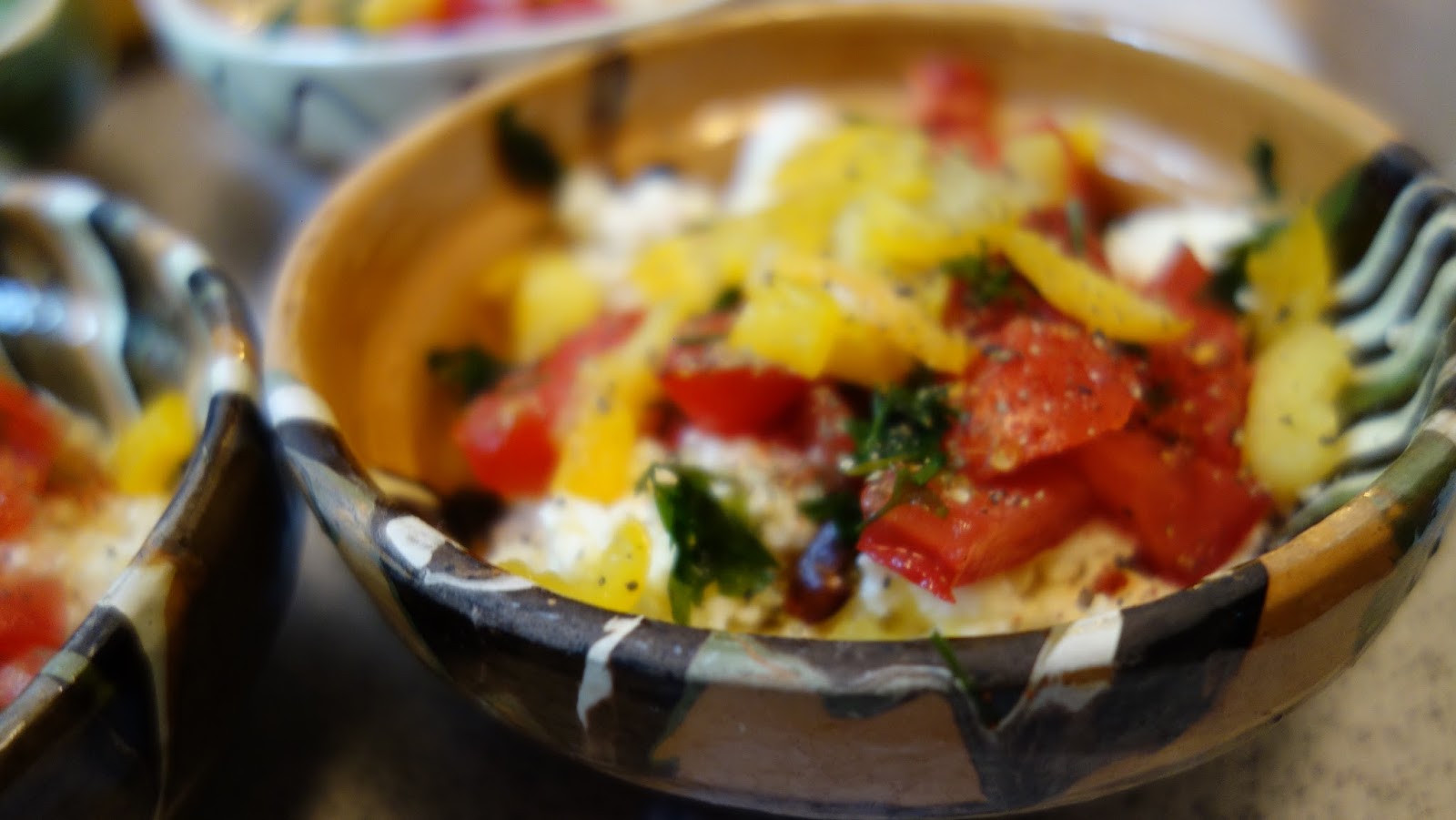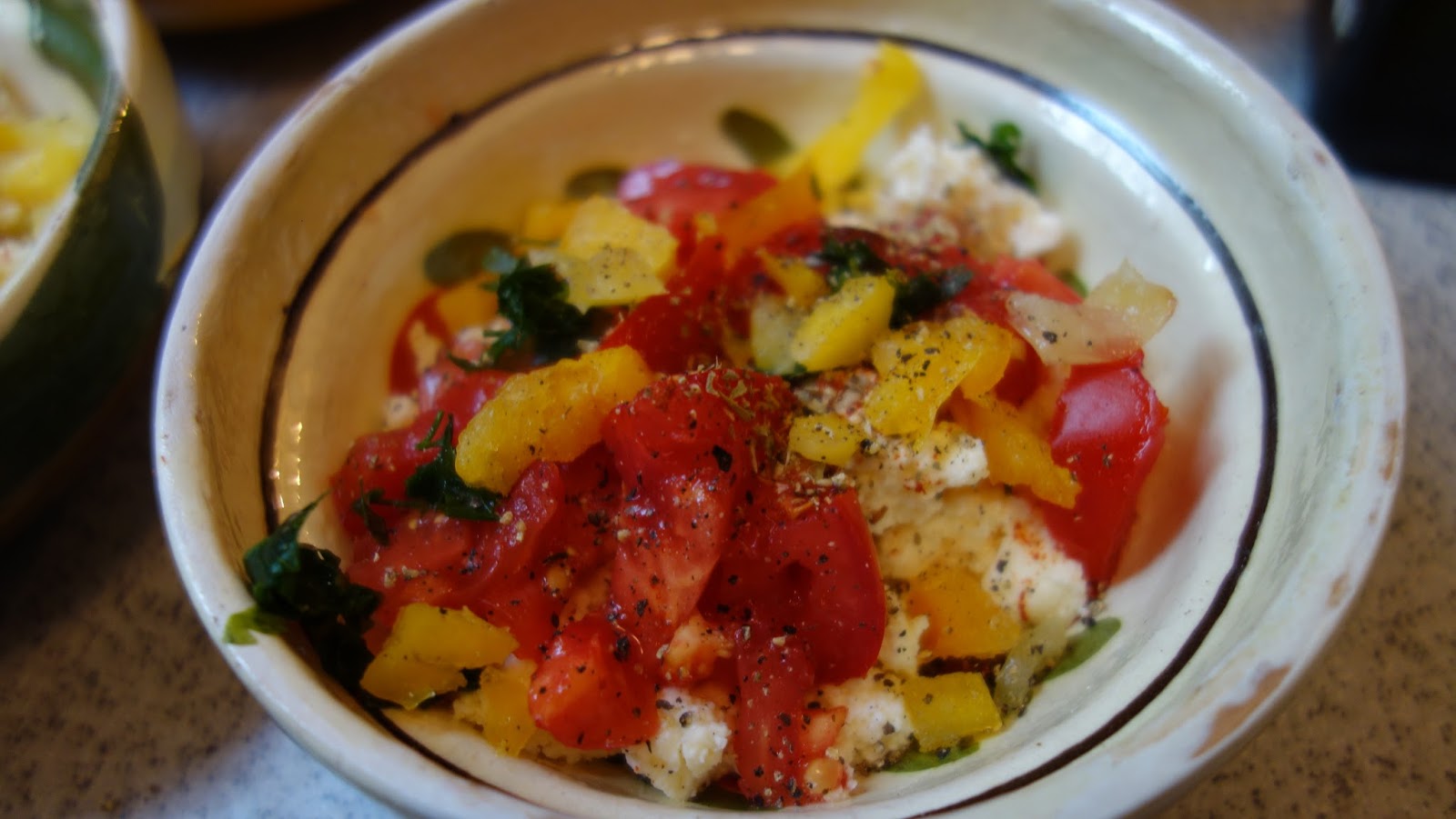 ividuale, se aseaza totul in straturi: branza, rosiile, ardeiul gras, patrunjelul, boiaua, uleiul de masline, piperul proaspat macinat, oregano uscat sau proaspat, sucul de la rosii se pune si el, chili, apoi eu am mai pus un rand de branza telemea zdrobita, un rand de rosii si am presarat cascaval pe deasupra si putin parmezan, foarte putin.
