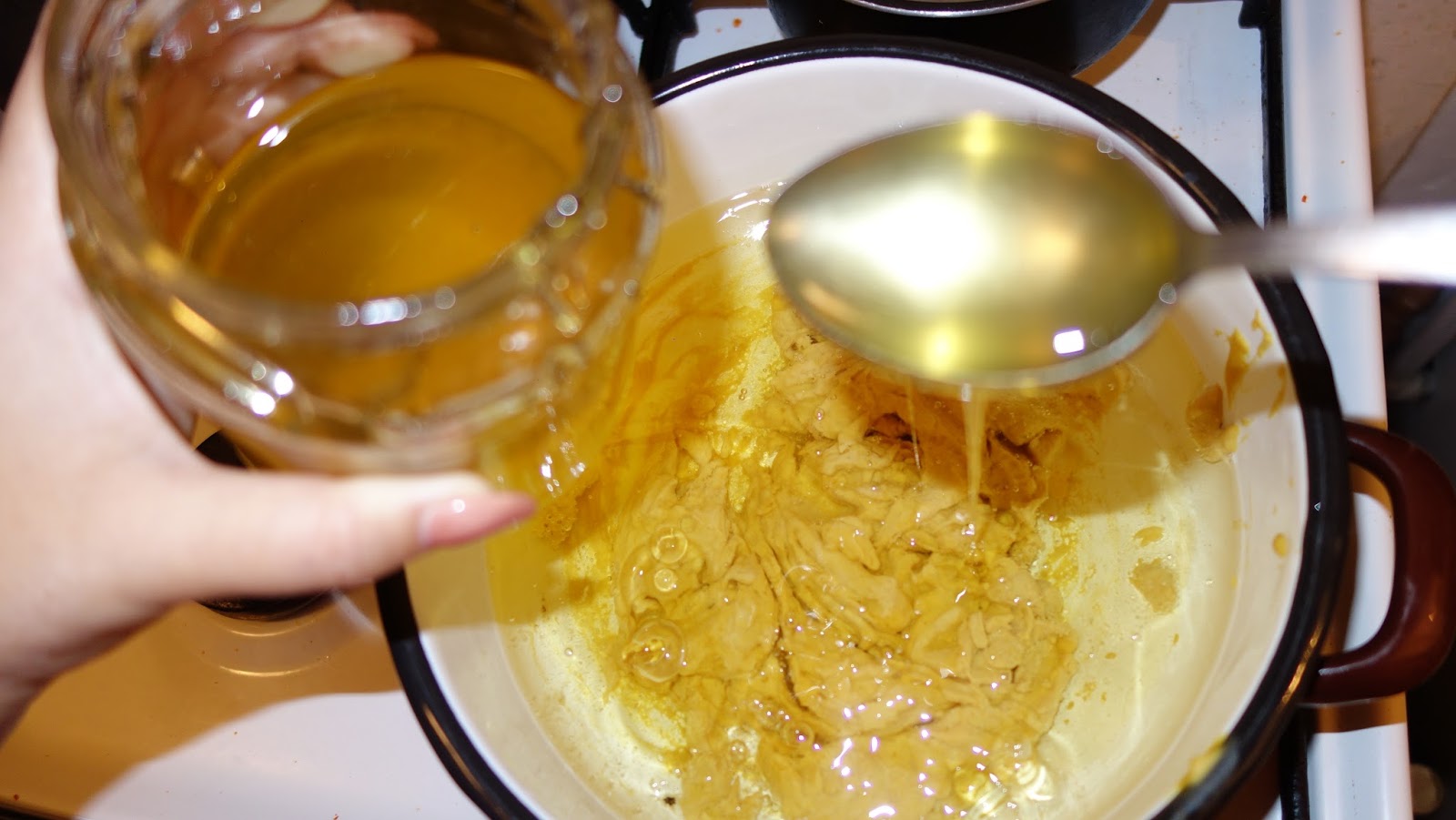 Am pus pe foc uleiul, apoi mustarul ( puteti folosi mustar dulce, sau mustarul vostru preferat ), apoi mierea. Le-am amestecat bine pe foc pana s-au facut si ele ca o pasta, peste care am adaugat ardeiul tocat mai devreme.
