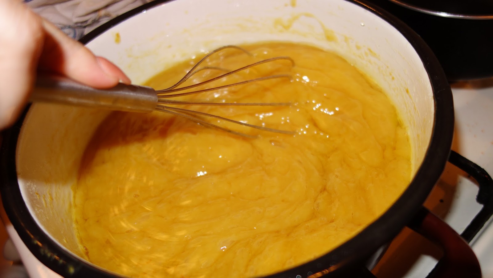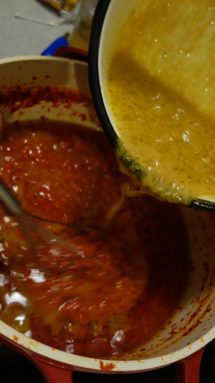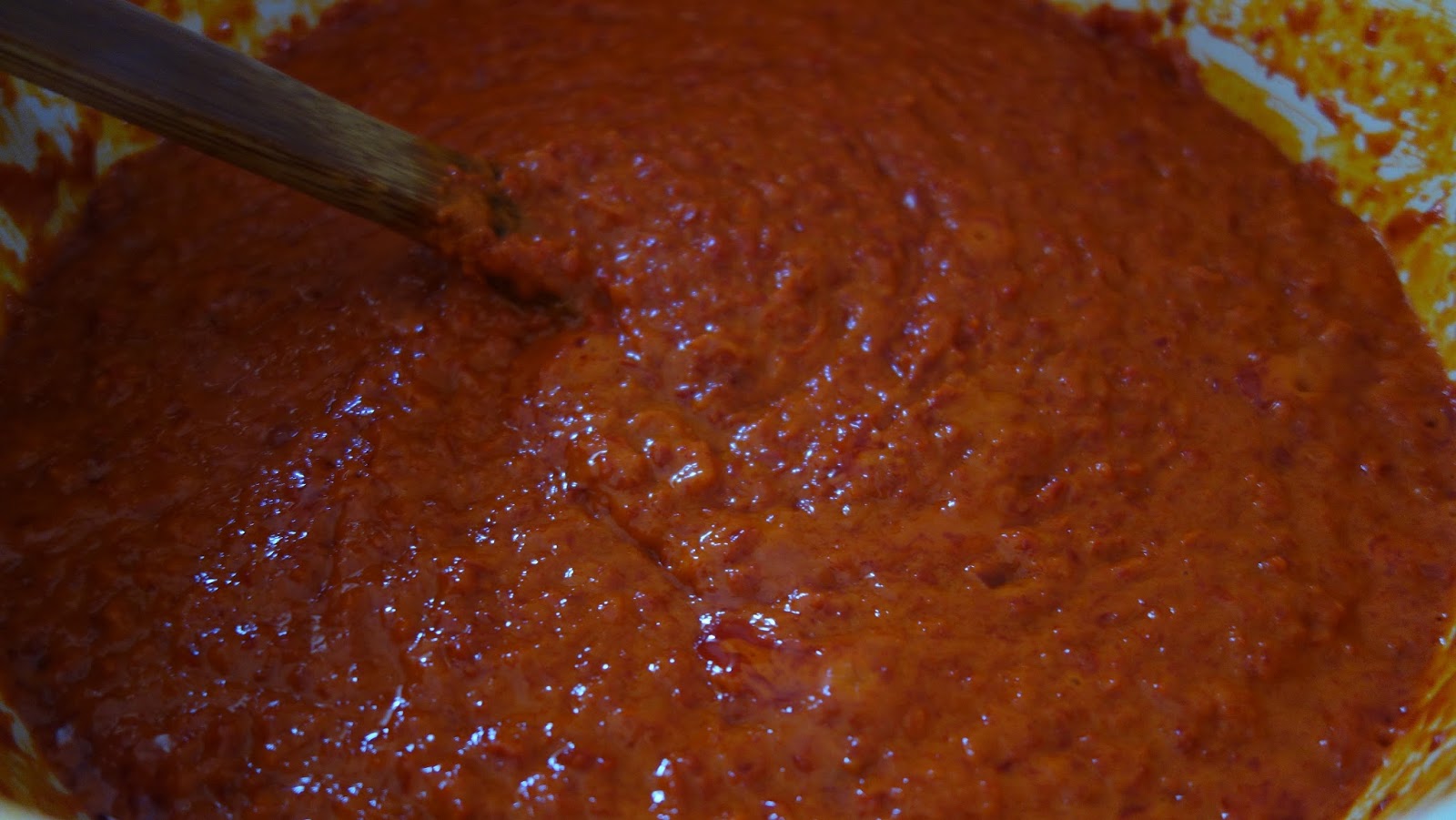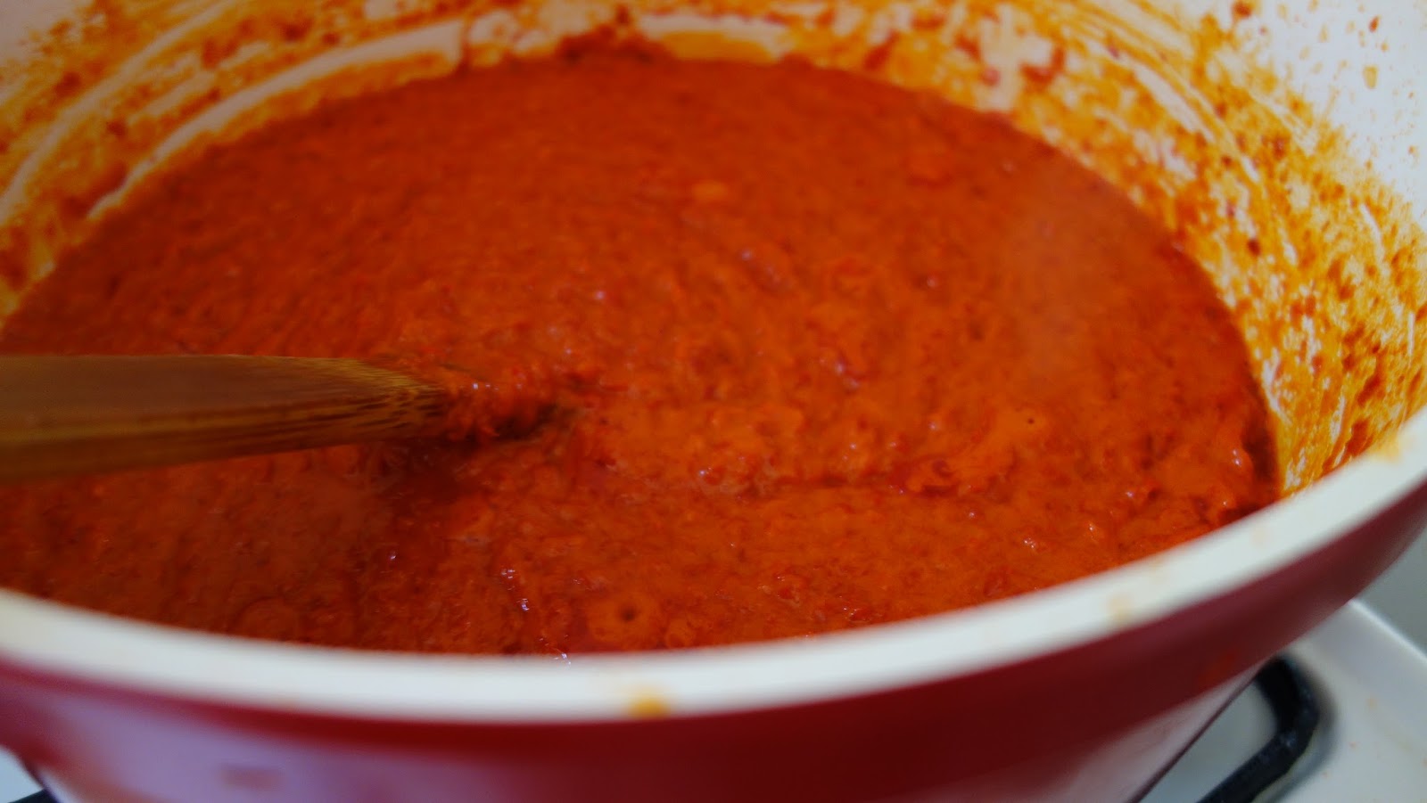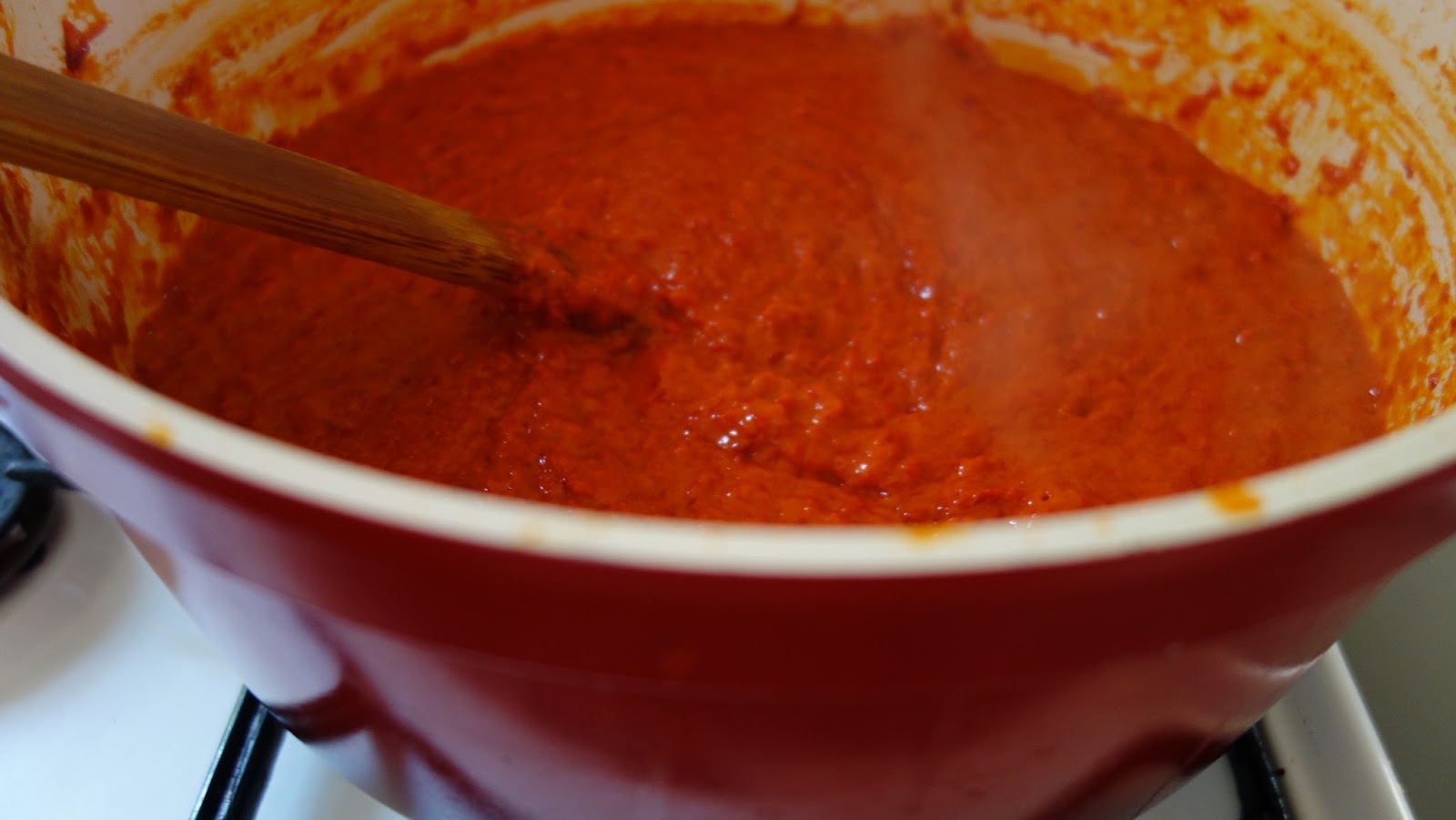 Am oparit ardeiul capia, adica am fiert apa si am turnat peste el. L-am lasat sa se scurga si l-am taiat bucatele, scotand semintele, apoi l-am dat prin blender si l-am pus la fiert cu putin ulei.