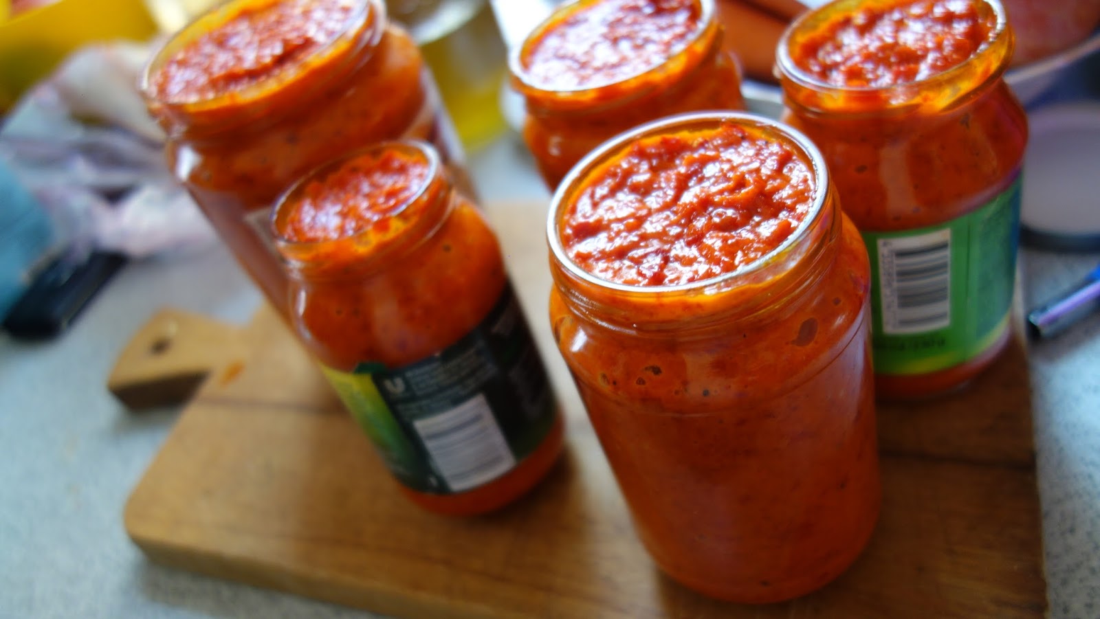 Se amesteca bine si se lasa sa fiarba pana cand uleiul iese la suprafata. Apoi, am adaugat sarea si putin piper, dupa gust. Am amestecat bine si am oprit focul. Am lasat pasta sa se racoreasca circa 30 min si am turnat-o in borcane. Le-am intors cu capacul in jos si le-am lasat asa pana a doua zi, acoperite cu un prosop.