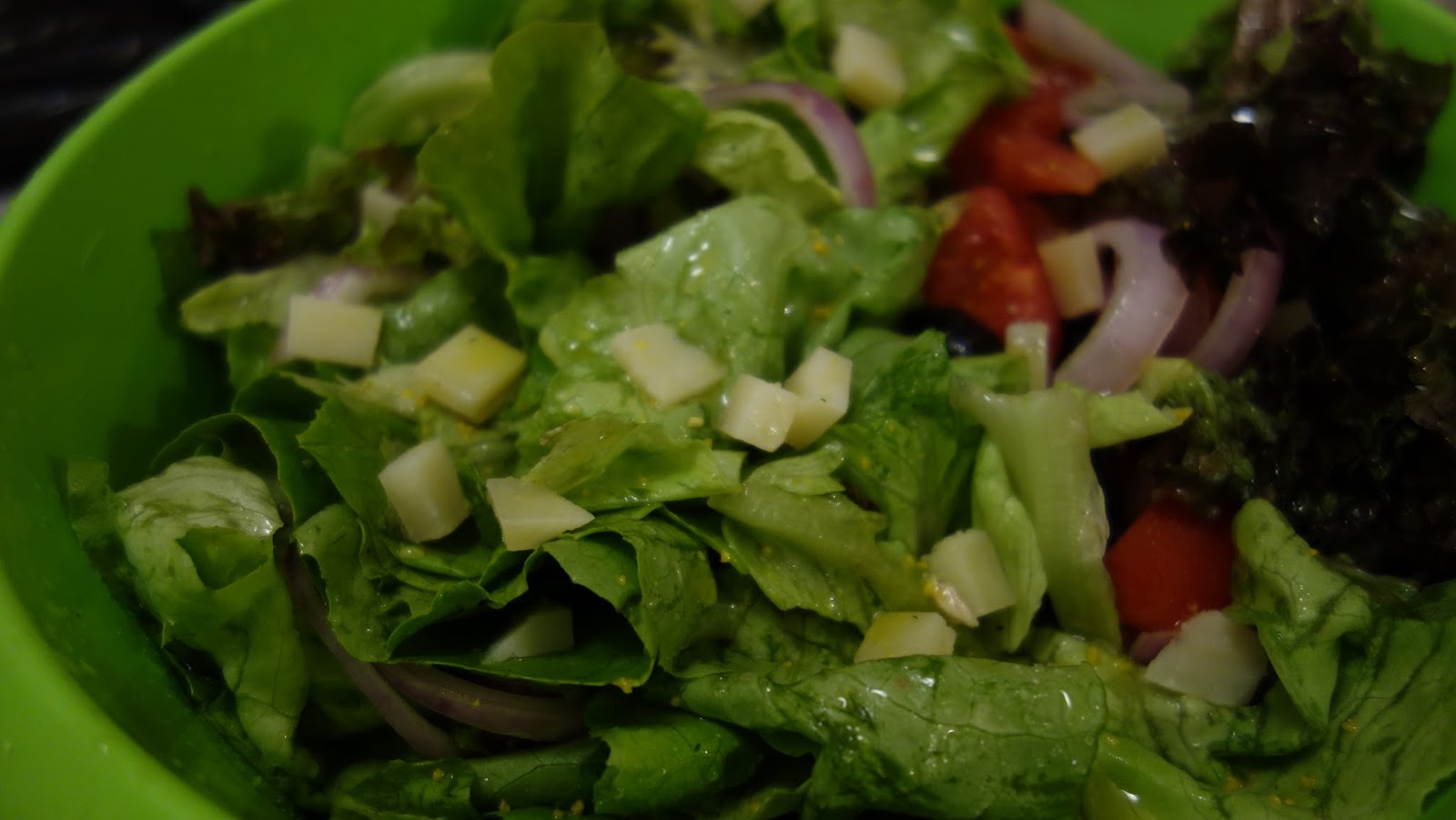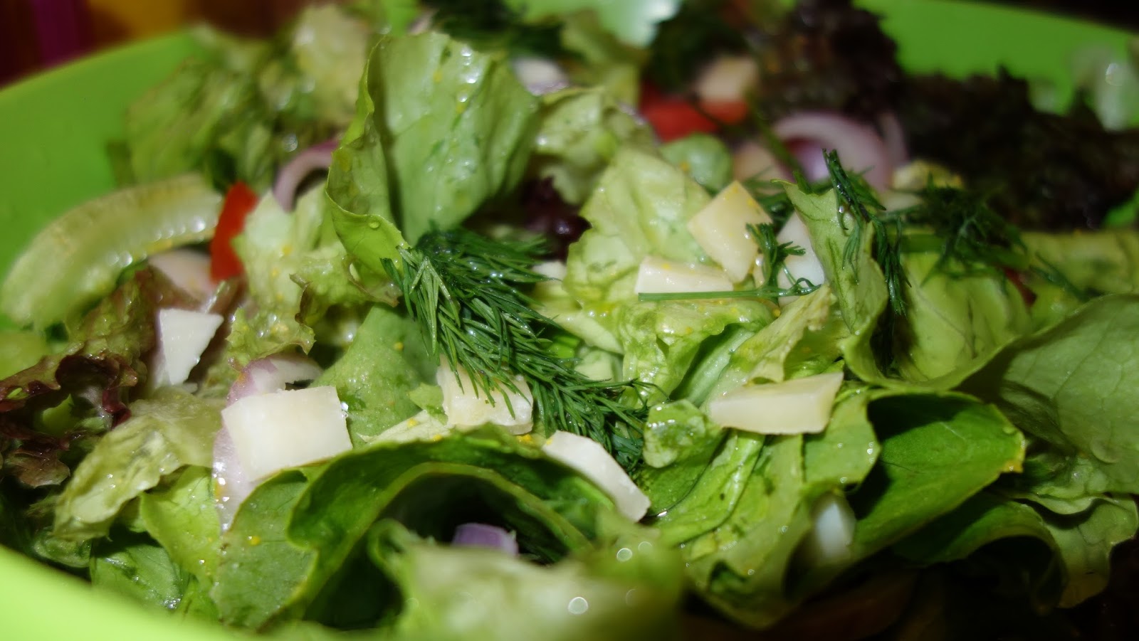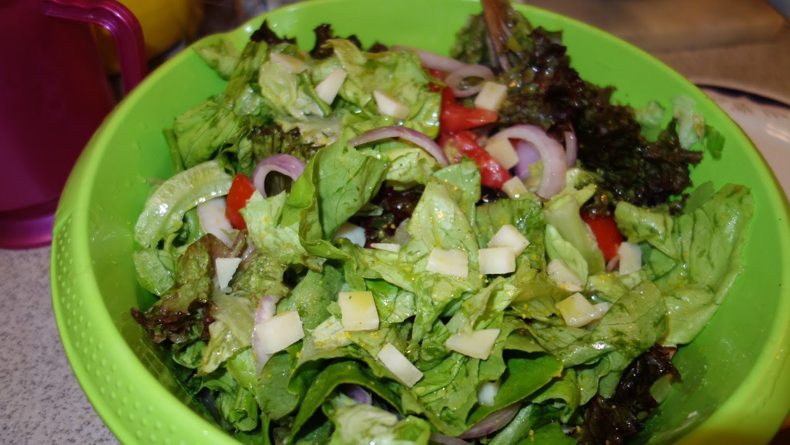 Am facut o salata verde cu ceapa, rosii, sare si ulei de masline si am presarat pe deasupra cateva bucatele taiate foarte mici, de cascaval.