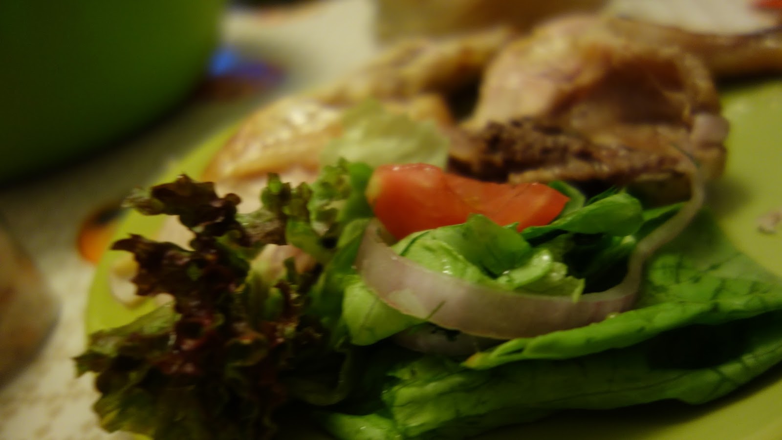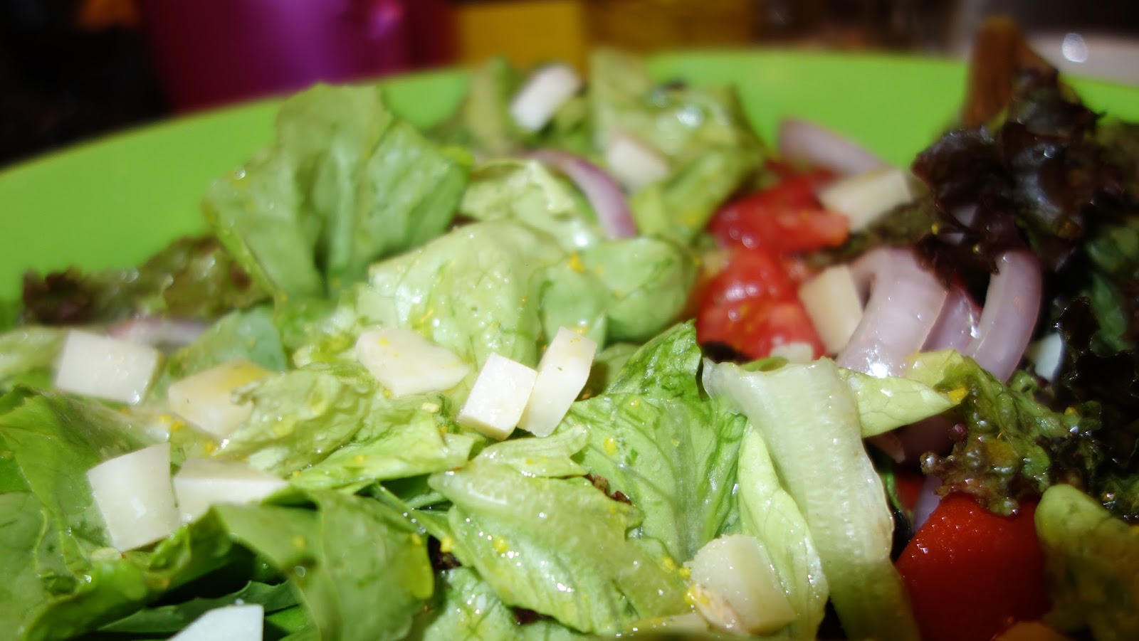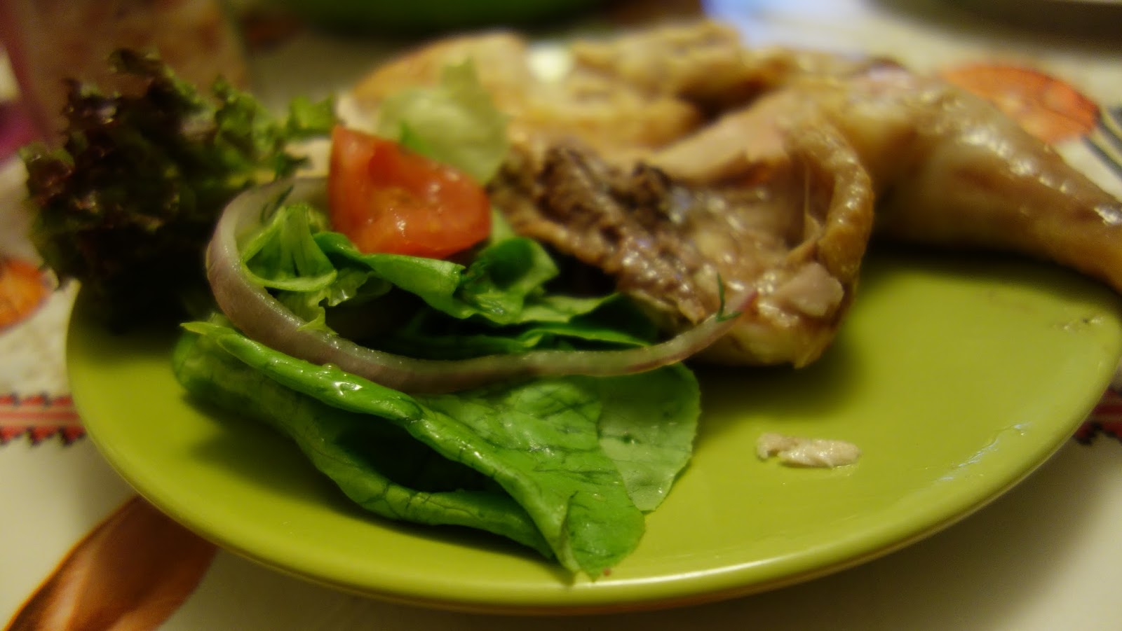 Am facut o salata verde cu ceapa, rosii, sare si ulei de masline si am presarat pe deasupra cateva bucatele taiate foarte mici, de cascaval.