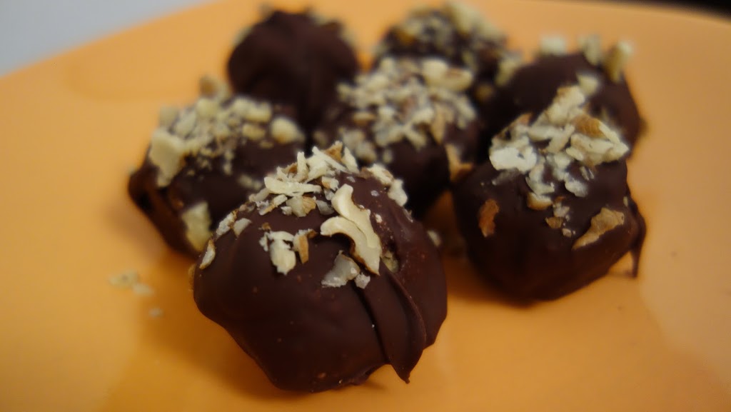 Am scos bilutele de la frigider si le-am rostogolit prin ciocolata Nestle Dessert Noir topita, le-am asezat pe un grilaj deasupra tavii acoperita cu foaie de copt, ca sa nu se umple cu ciocolata si am presarat nuci deasupra, apoi le-am bagat din nou la frigider.